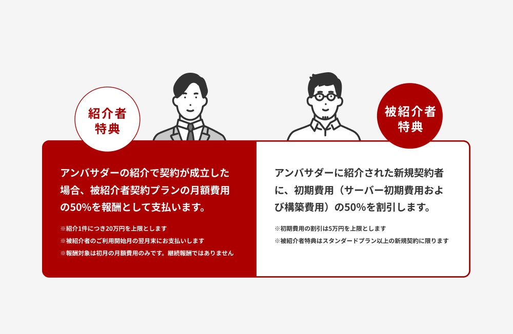 アンバサダーからの紹介で契約が成立すると、紹介者・被紹介者ともに特典付与の対象となります。