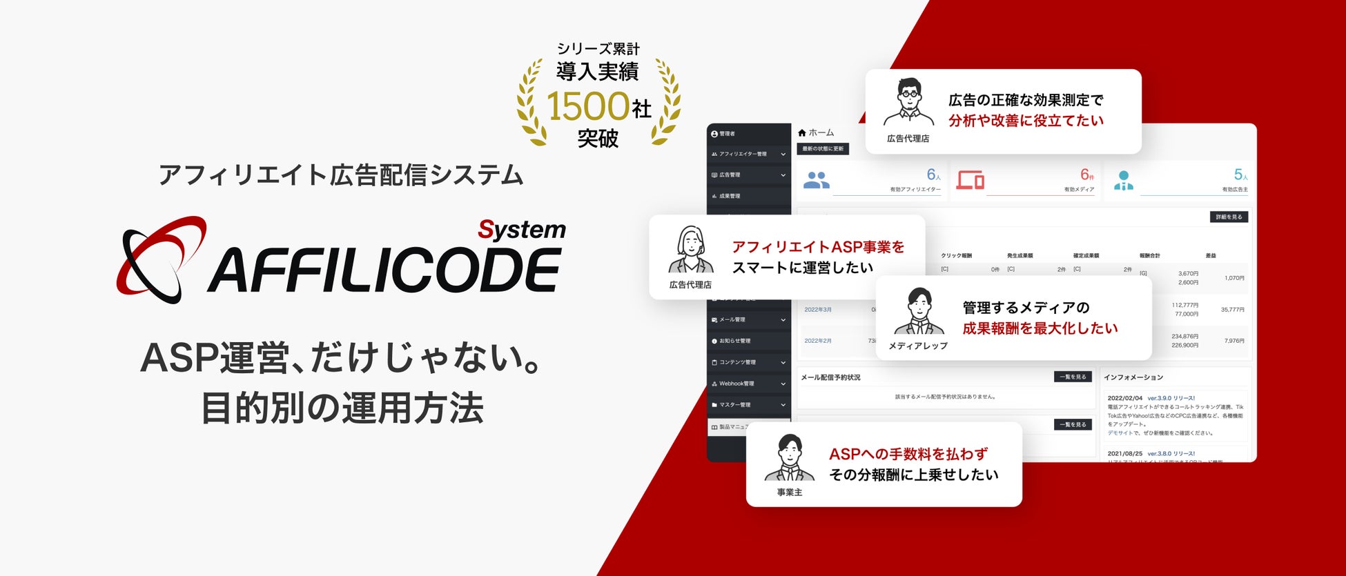 アフィリコード・システムは「いいものに出会う、きっかけ創り」をミッションに、企業・ASP・ユーザーに最適な出会いをもたらす広告をサポートしてきました。2月26日には、ASP間の連携を簡略化する機能を備えたVer.3.15をリリースするなど、日々アップデートを続けています。