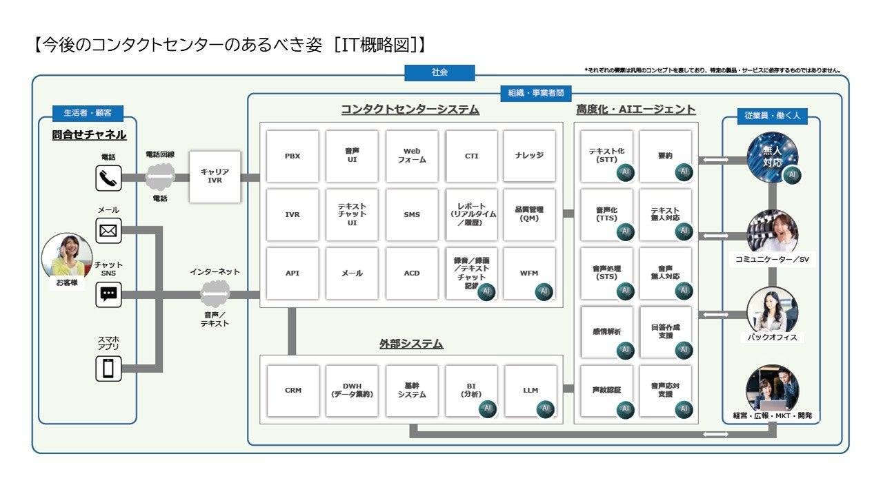 近年、コールセンターは電話のみならず、メールやチャット、SNSといったマルチチャネルによる対応が主流になっていることから「コンタクトセンター」とも称されます。加えて、AIなど最新テクノロジーの導入・活用によるデジタル化の推進を通じて、リアルタイムに寄せられるデータを活用することで顧客体験価値向上(CX)や開発、マーケティングに資する役割を担っています。(※今後のコンタクトセンターのあるべき姿 [IT概略図]参照)