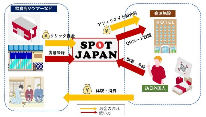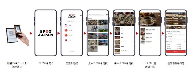 「SPOT JAPAN」は訪日観光客がホテルや民泊に宿泊した際に、客室内に設置された「QRコード」を自分のスマートフォンで読み込むだけで、ホテル周辺の「レストラン」や「体験スポット」「お土産店」などの情報に多言語(英語・中国語・韓国語)でアクセスできる観光ガイドサービスです。観光客はアプリのダウンロードやログインが不要で、地元の最新情報を簡単にアクセスでき、Web検索やホテルのスタッフに頼らずスムーズな観光体験が可能となります。
