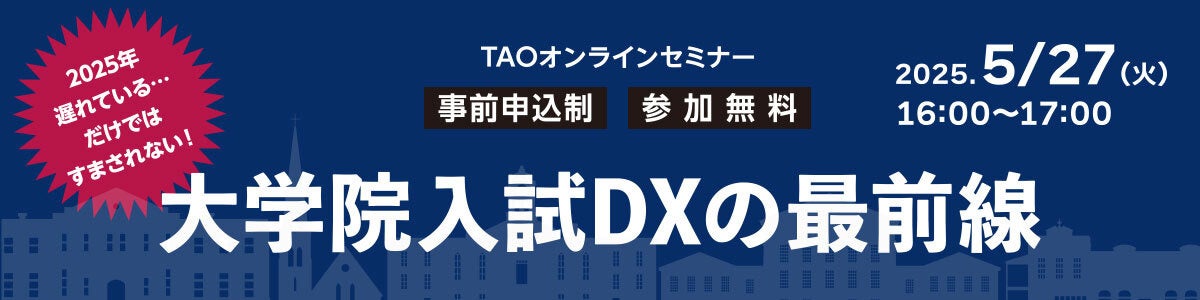 ペーパーベースの出願処理、煩雑な書類準備、人手不足、コスト増…現場が抱える課題をDXでどう解決できるのか? 本セミナーでは、実際の導入事例をご紹介しながら、世界標準入試システム「TAO(The Admissions Office)」で実現する大学院入試改革についてご説明します。