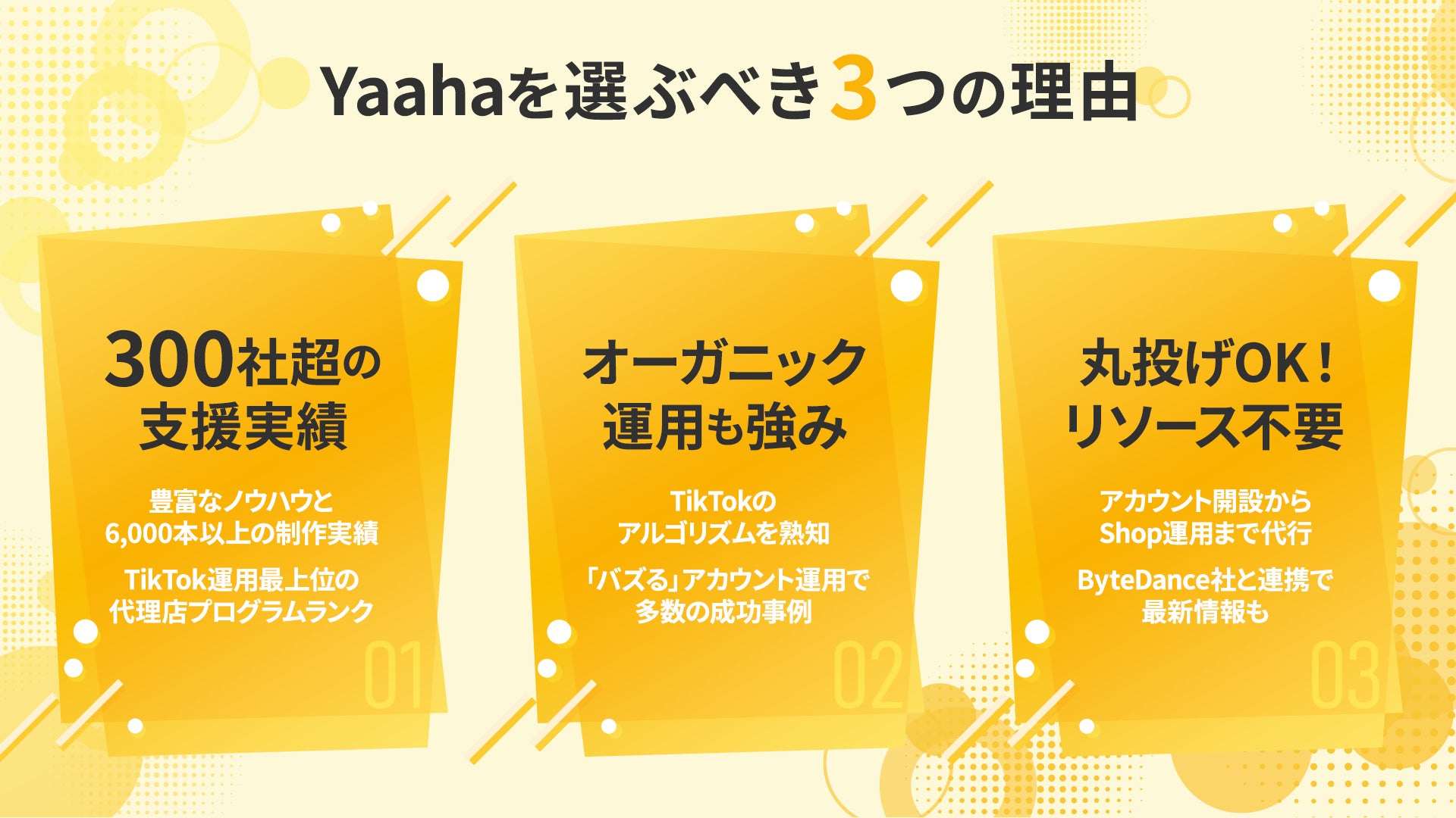 株式会社Yaahaは、TikTokをはじめとするショート動画広告の制作・運用に特化した広告代理店です。「ショート動画でインパクトを創り出すクリエイティブカンパニー」をテーマに、中小企業から大手企業まで300社以上のTikTok広告を支援しています。