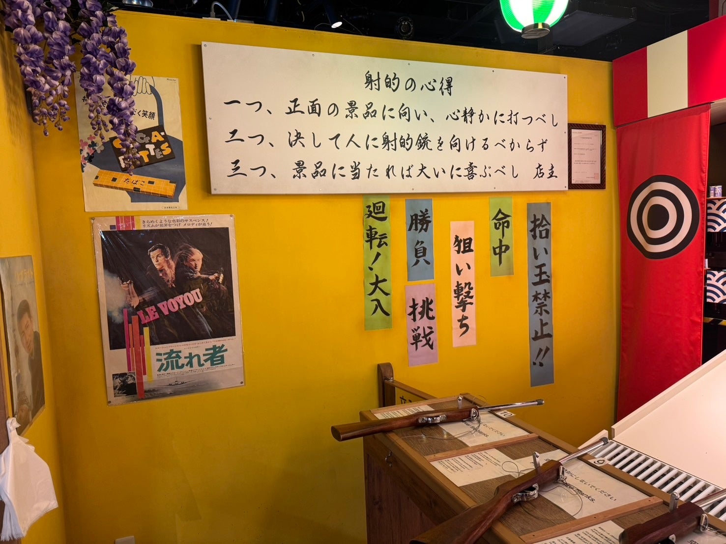 ・レトロ再現の演出:木製カウンター、昭和感ただよう看板、そして“コルク銃”による本格的射的が体験可能です。