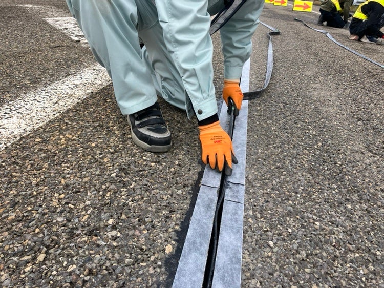アスファルトに溝幅約20〜30mmを切って差し込むだけの革新的な”縦入れ工法”を実現。