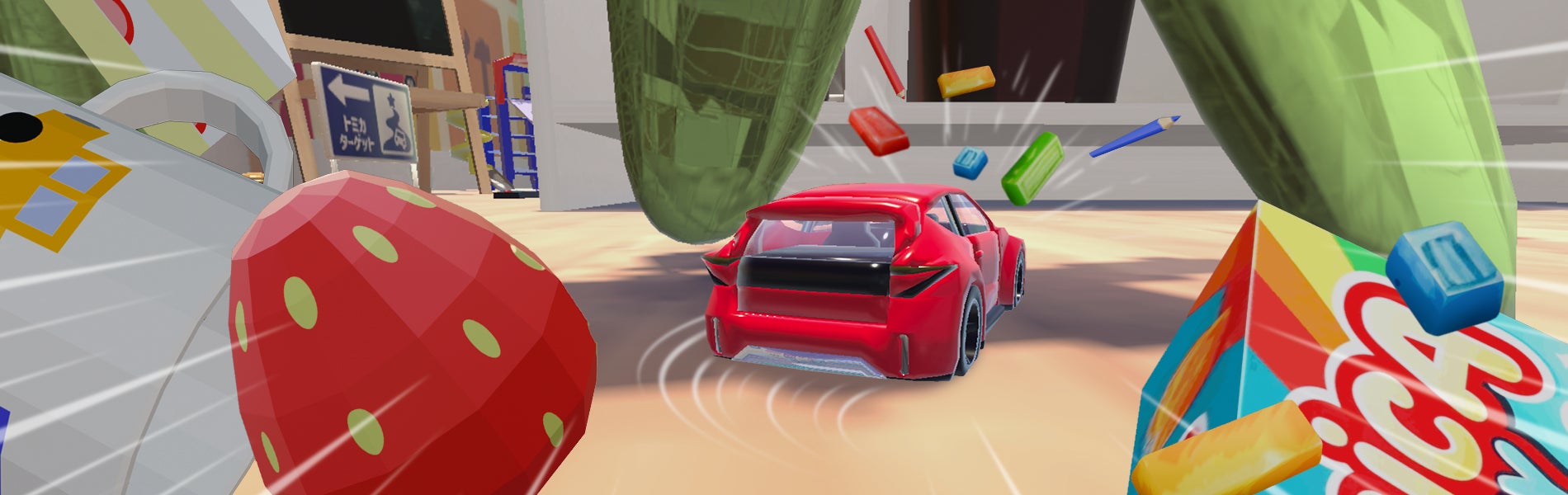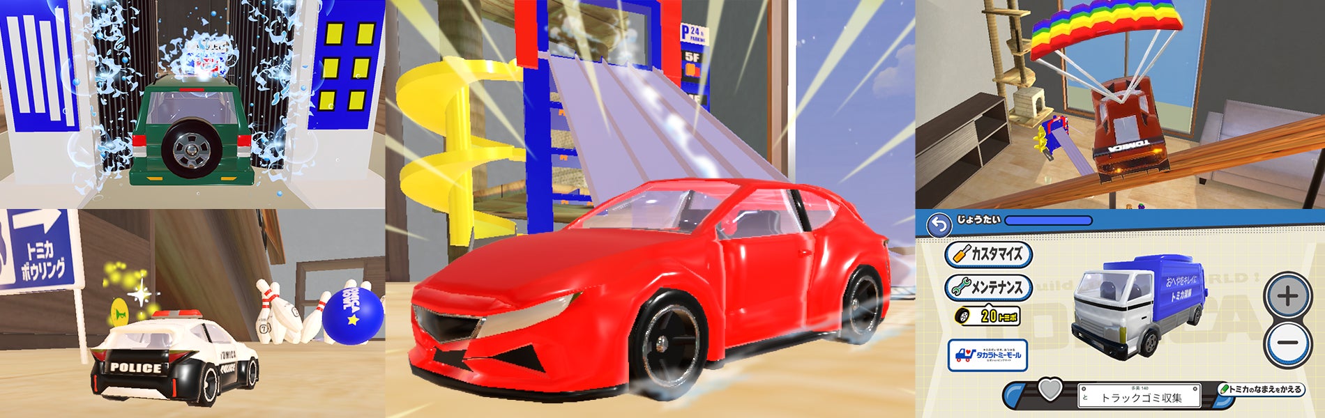 椅子や机、ロボット掃除機などのおうちにあるような家具の間をスイスイすり抜けたり、床に落ちている小物を跳ね飛ばしたりしながら駆け抜けるだけでなく、実際に販売されている「トミカ」シリーズの「トミカスライダーパーキング」や洗車場といった「トミカ」のおもちゃで遊ぶことも可能でアプリならではの遊びと「トミカ」本来の遊びの楽しさを同時に感じていただけます。