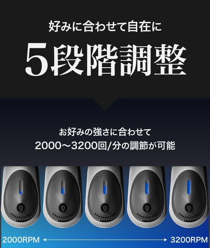 体調や目的に応じて選べる最大3200回/分の振動を誇り、