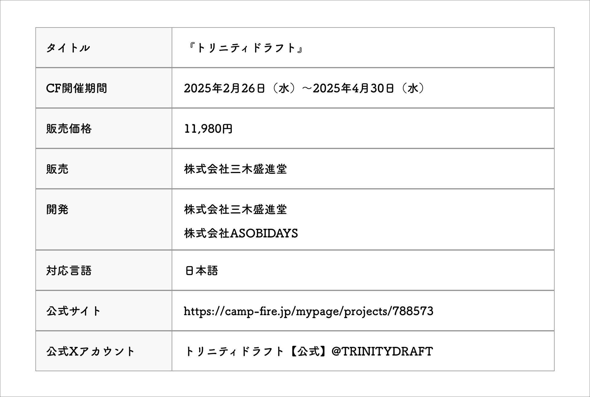 京都の太秦で50年以上にわたり染色用粘着テープの卸売業や印刷サービスを展開する株式会社三木盛進堂(代表者:三木幸彦 本社:京都市)は、トレーディングカードゲーム(TCG)の要素を取り入れた、新ジャンルのカードゲーム「リミテッドトレーディングカードゲーム(LTCG)」を開発。第1弾『トリニティドラフト』の販売に先立ち、クラウドファンディングをCAMPFIREにて2/26から実施します(URL:https://camp-fire.jp/projects/788573/view)。このゲームは、現在のトレーディングカードゲームバブルが引き起こす投機性や資源問題を解決するため、全カードセット売り”で販売される3人プレイ専用カードゲームです。コンセプトに共感したタカヤマトシアキ氏がキービジュアルを担当しました。