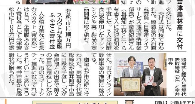 また、会社設立以来、会津若松市以外への寄付を含め、累計金額は1,000万円以上となりました。今後もCSR(企業の社会的責任)へ積極的に取り組んで参ります。