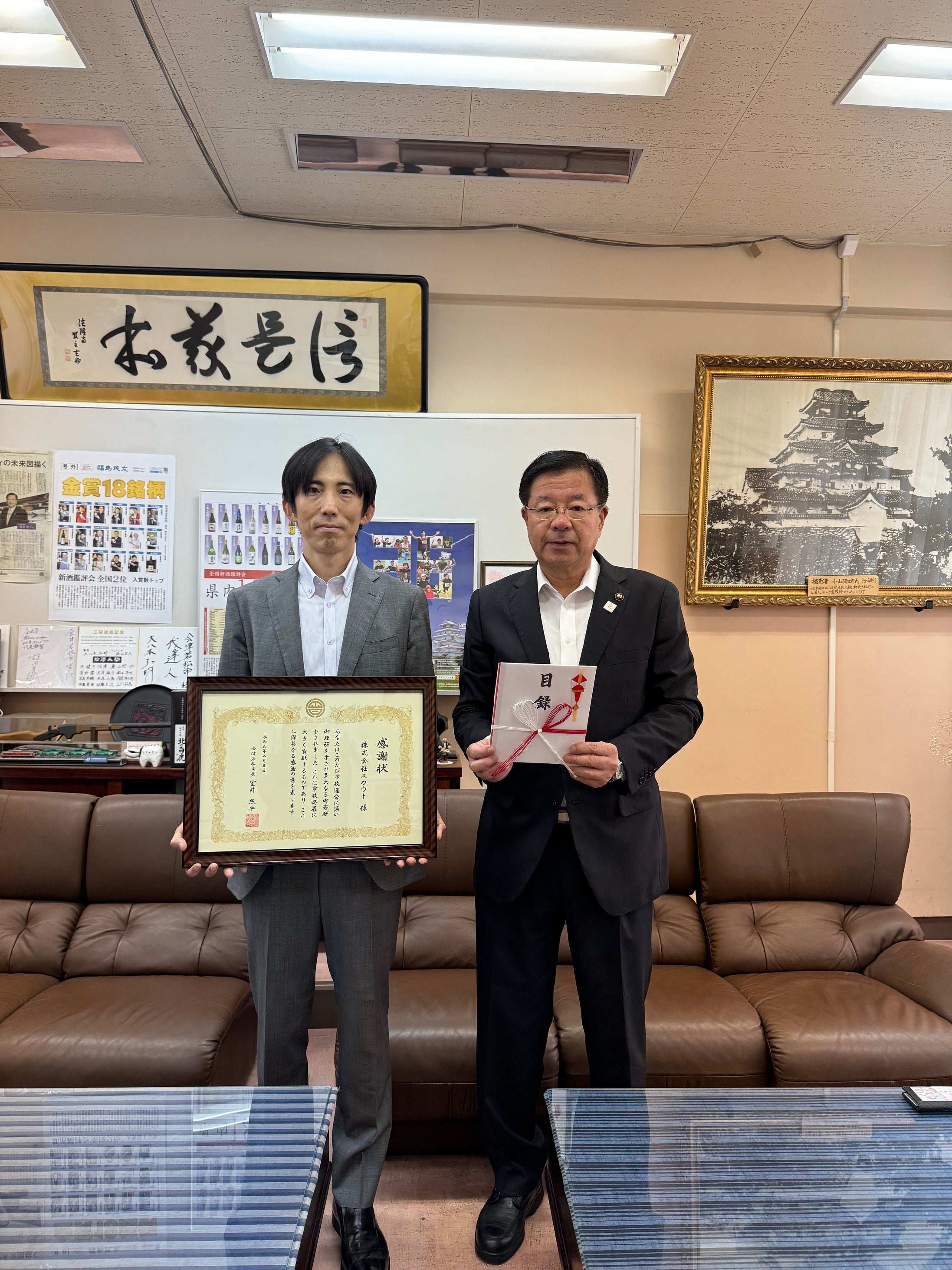 この寄付に際しまして、2025年7月25日に会津若松市の市役所において贈呈式が開催され、室井照平市長より、当社代表取締役・馬場俊介へ感謝状が授与されました。