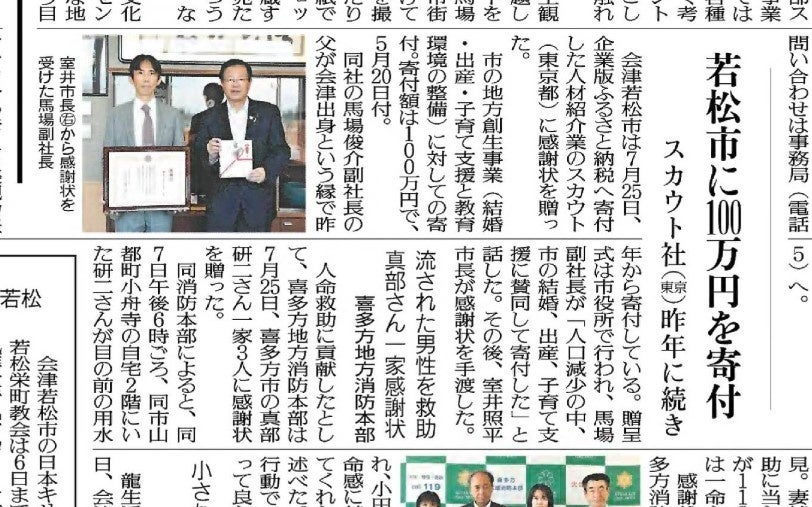 株式会社スカウト(東京都中央区銀座 代表取締役:馬場俊介)は、企業版ふるさと納税を活用し、福島県会津若松市に累計200万円を寄付いたしました。当社が会津若松市に企業版ふるさと納税をするのは2024年に続き、2度目となります。