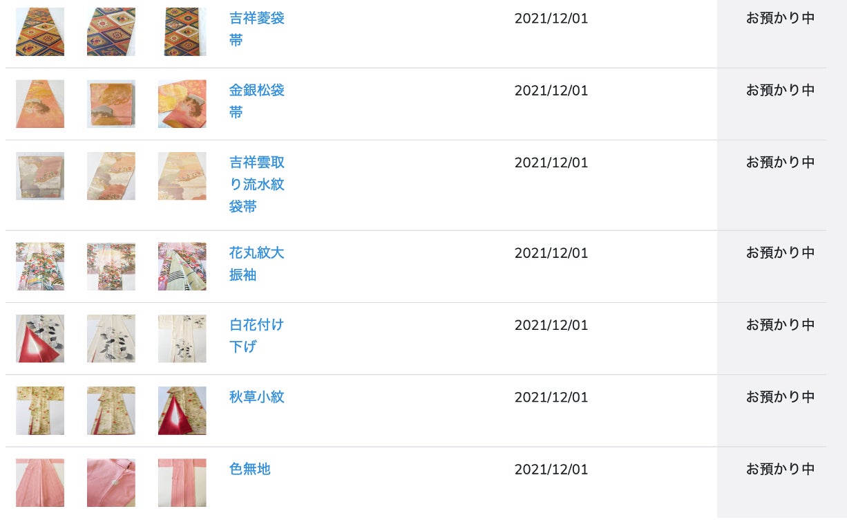<ご利用の流れはシンプル> ウェブサイトから専用の「着物回収袋」を申し込み、届いた袋に預けたい着物を入れて返送するだけ。 お預かりした着物は、1点ずつ写真撮影を行い、ウェブ上のマイページからいつでも閲覧可能です。(料金:10点 2,200円〜)