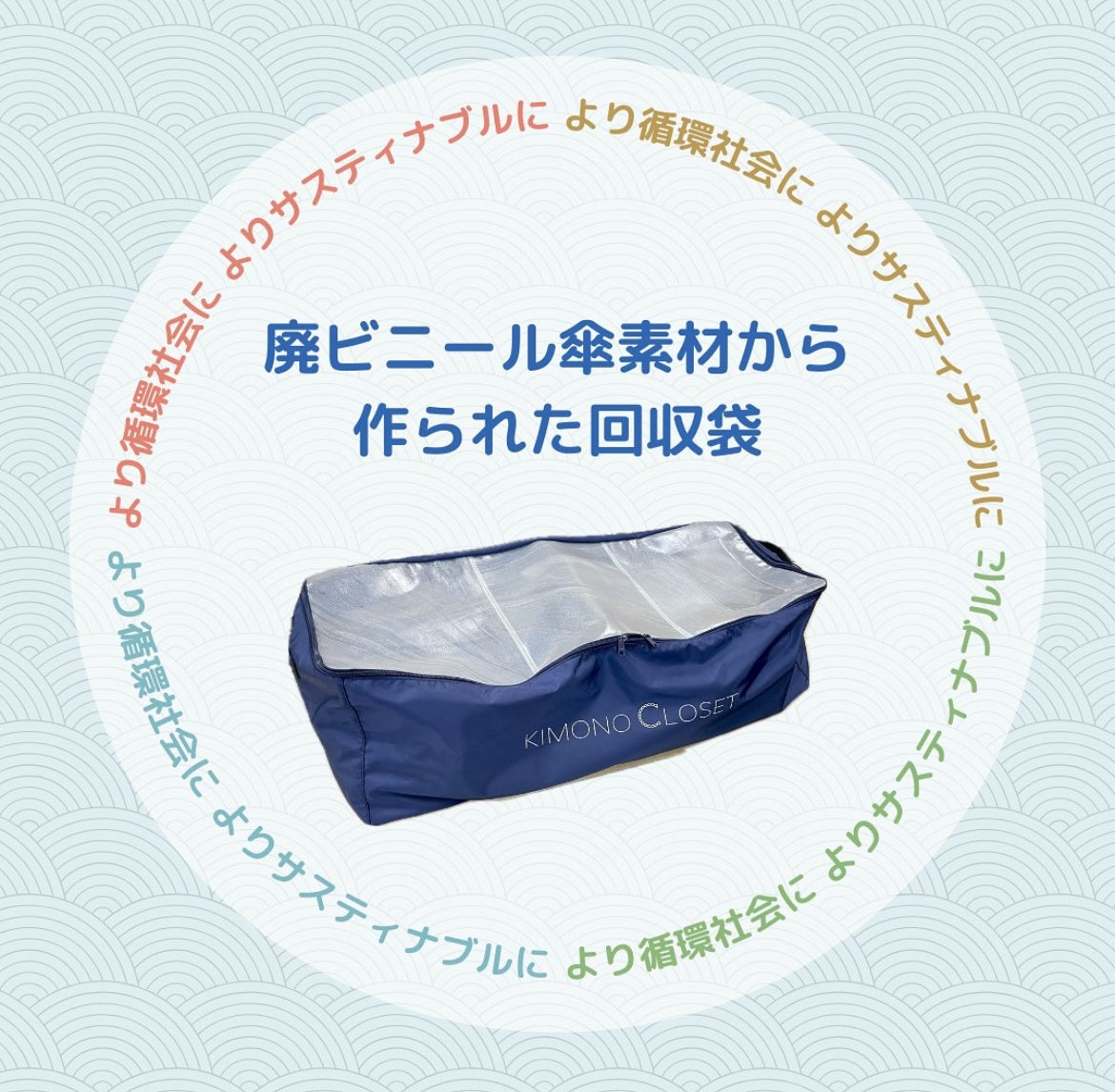 環境への配慮をさらに強化するため、PLASTICITY社の技術を採用した「着物回収袋」を新たに導入いたしました。 これまで使用していた使い捨て段ボールに代わり、廃棄されたビニール傘を再活用した素材を採用。着物を守る耐久性と、廃棄物削減を両立し、よりサステナブルな取り組みを推進してまいります。