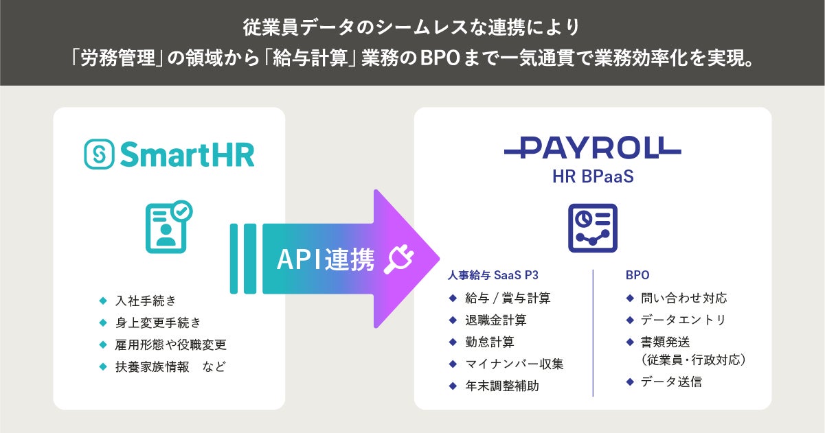 株式会社ペイロール(本社:東京都江東区、代表取締役社長:湯浅哲哉、以下:ペイロール)が提供する大企業向け給与計算業務アウトソーシングサービス「HR BPaaS(エイチアールビーパース)」と、株式会社SmartHR(本社:東京都港区、代表取締役CEO:芹澤雅人、以下:SmartHR)が運営するクラウド人事労務ソフト「SmartHR(スマートエイチアール)」はAPI連携(※1)することになりました。