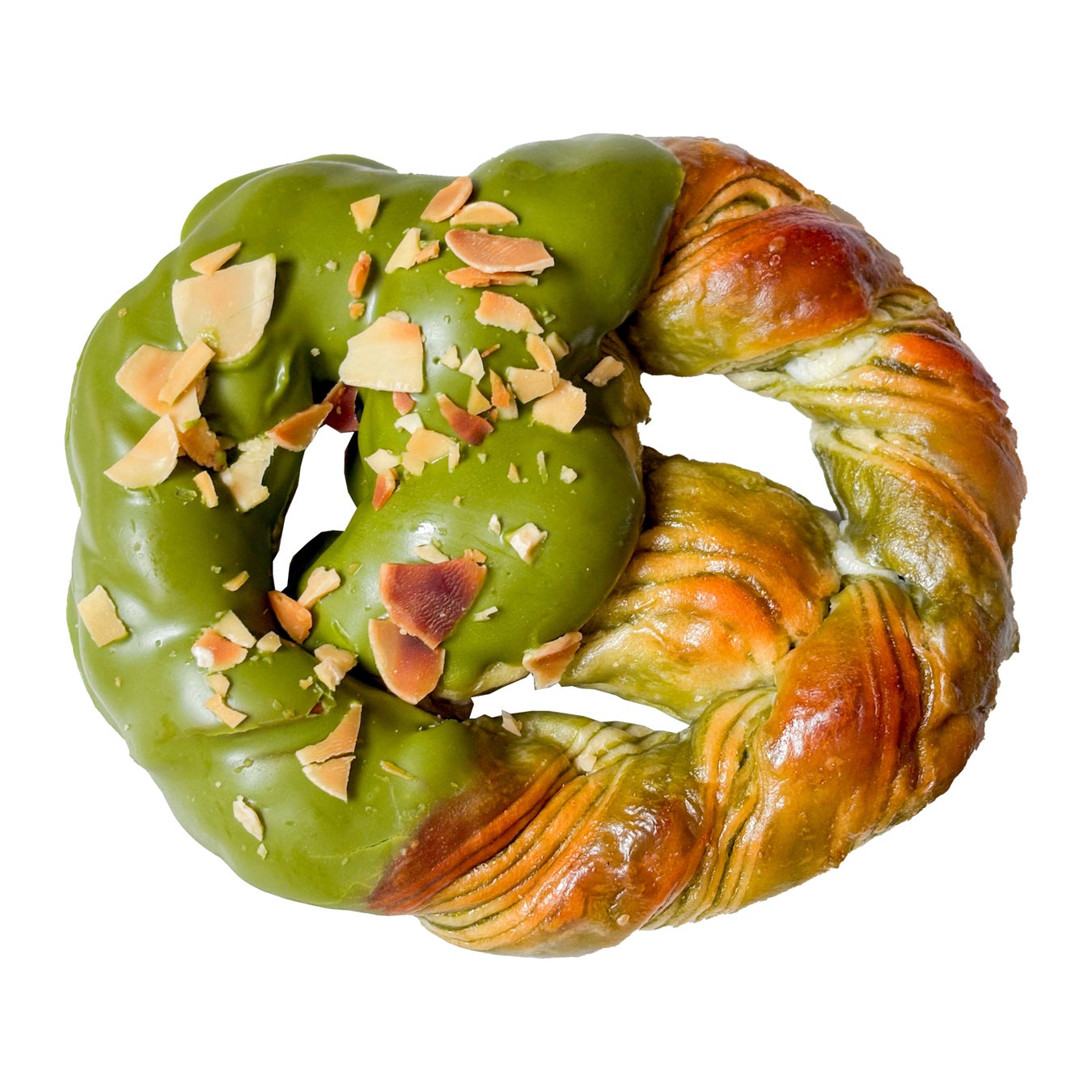宇治抹茶のシートを生地に織り込んだ見た目も華やかなプレッツェル型の商品。