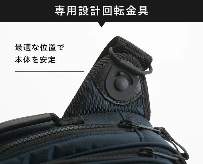 開閉に最適な位置で本体を安定させてベルトで吊ることが可能な回転金具で快適に開閉でき、回転角度を制限することにより、クルクル回転せずにねじれを防止します。