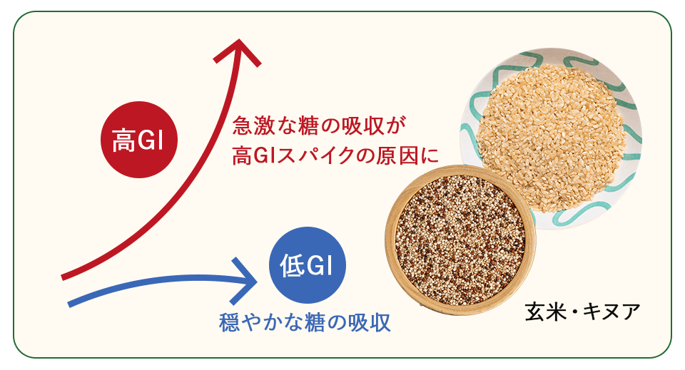 栄養設計の要は低GI(グリセミック・インデックス55以下)。さつまいも、ポテト、白米、とうもろこしなど高GI食材を避け、朝食後の血糖値上昇を穏やかに抑えることで、体への負担を軽減します。