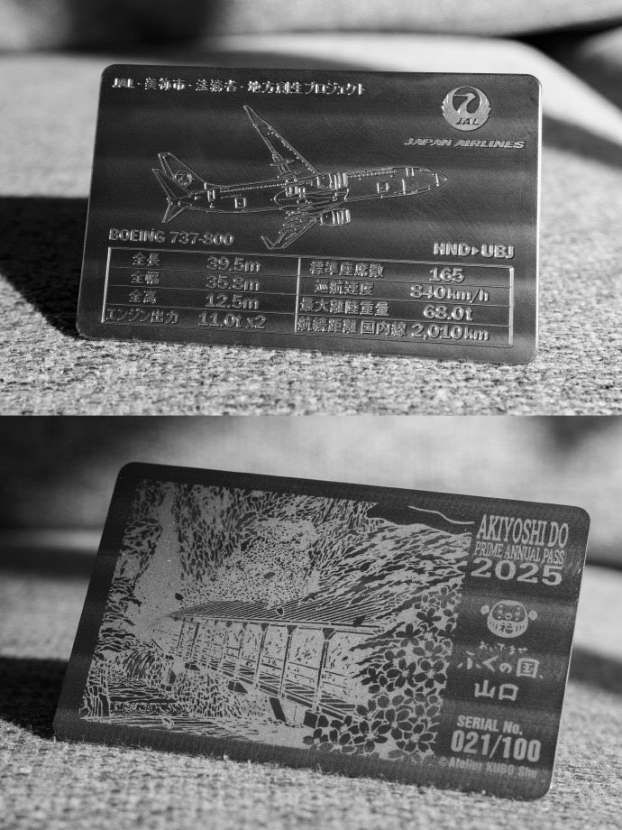 美祢市は、カルスト台地をはじめとする多様な地質資源に恵まれた自然豊かな地域です。物販コーナーでは、そんな自然が育んだ「美東ごぼう」や「秋芳梨(しゅうほうなし)」など、地元の魅力が詰まったこだわりの特産品を取り揃えています。さらに注目は、「共生のまちづくり地方創生推進事業」の一環として誕生した『秋芳洞プレミアムフリーパス』。日本を代表する切り絵画家・久保修さんがデザインを手がけ、JAL・美祢市・法務省の地方創生プロジェクトにより実現しました。幻想的な秋芳洞の風景と、東京(羽田)〜山口宇部間を結ぶJALのボーイング737が描かれた、ここでしか手に入らない特別な一枚です。数量限定の販売となりますので、この機会をお見逃しなく!美祢の自然・文化・想いが詰まった逸品を、ぜひお手に取ってご覧ください。