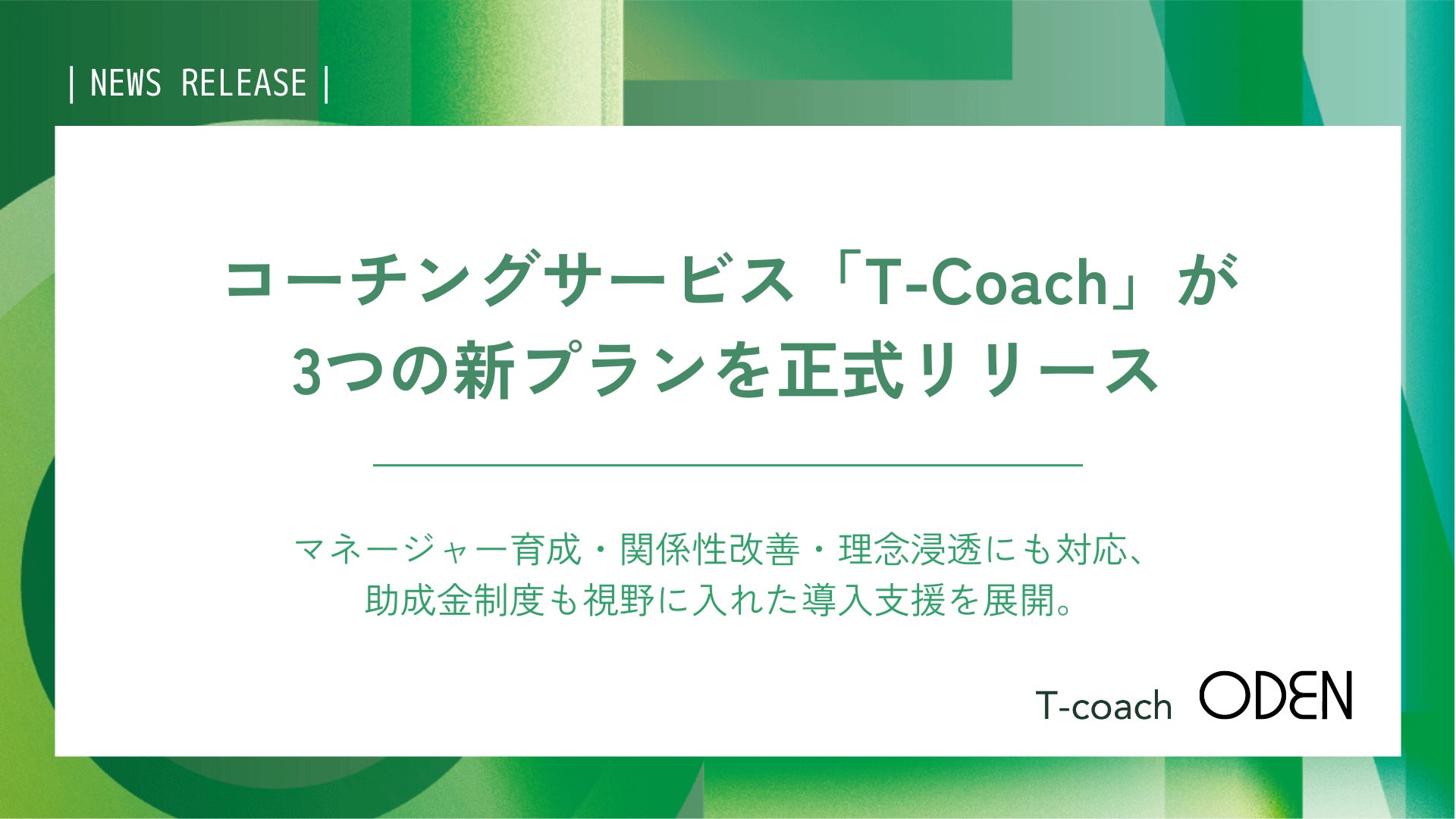 株式会社Oden(本社:東京都渋谷区/代表取締役:会川智華)は、2025年6月、組織における“人”の変化を支援するコーチングサービス「T-Coach(ティーコーチ)」において、新たに3つの支援プランを体系化し、正式リリースいたしました。