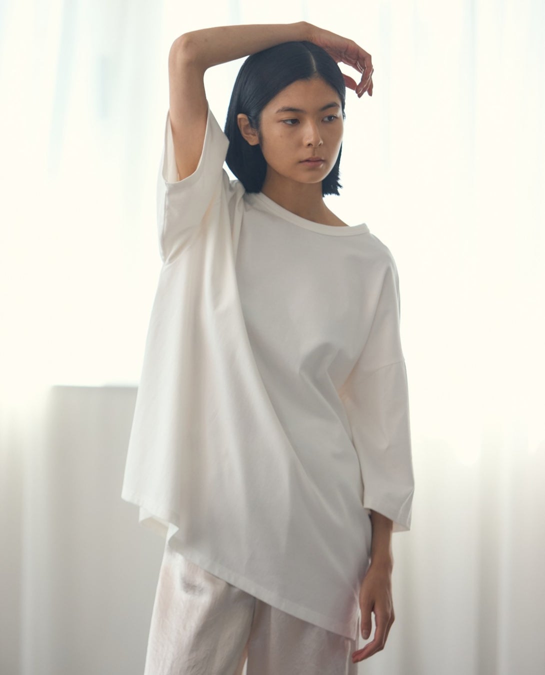 たっぷりとしたワイドシルエットと、やや詰まり気味のネックラインが絶妙なバランス。一枚で着ても様になる、肌ざわりもさらりとした、リラックス感あふれる一着です。