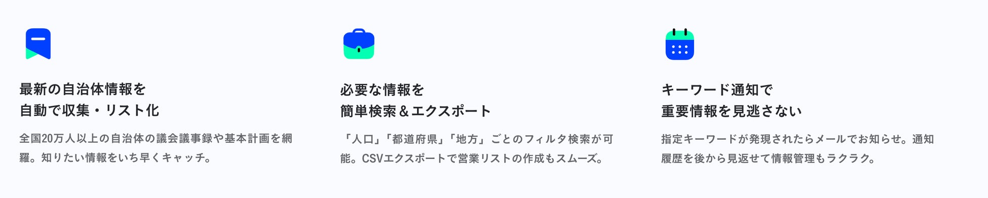 また、議員や部局別の発言傾向、予算規模、地域課題との照合なども網羅し、これまで属人性の高かった自治体営業の再現性と精度を大きく向上させます。