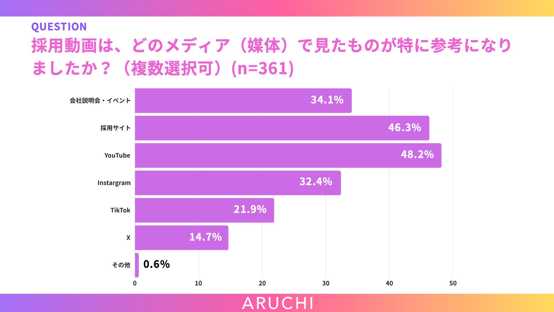 さらに、「どのメディアで見た動画が参考になったか」という問いでは、YouTube(48.2%)と採用サイト(46.3%)が上位に挙げられ、