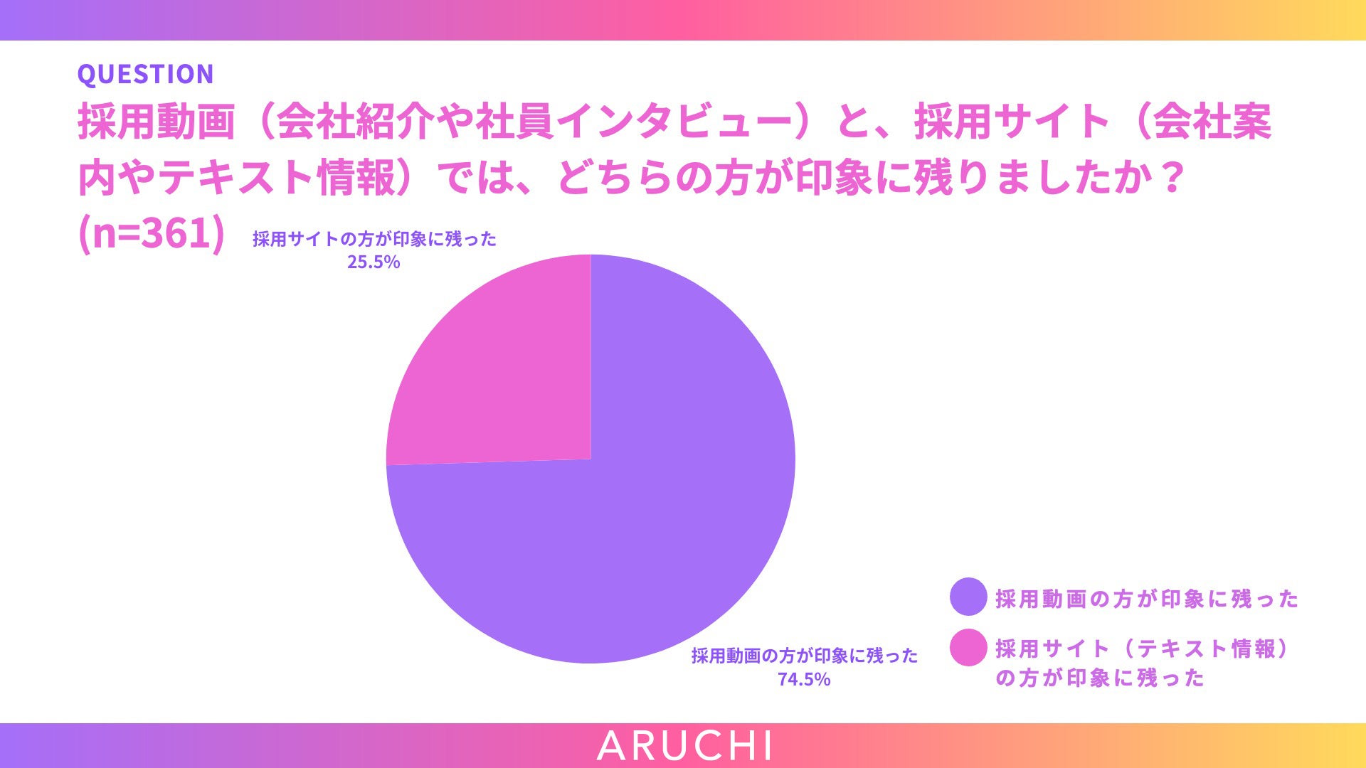 その印象度を比較したところ、全体の74.5%が「採用動画の方が印象に残った」と回答し、テキスト情報(25.5%)を大きく上回る結果となりました。