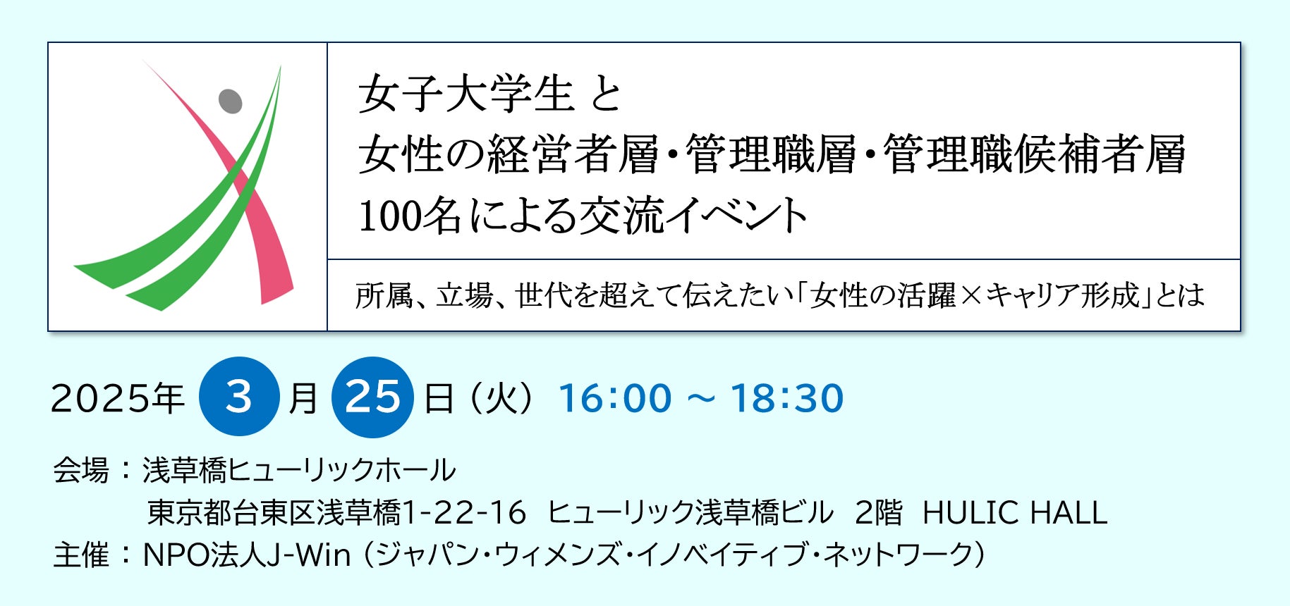 NPO法人J-Win(ジェイウイン、理事長:横尾敬介 東京都千代田区)は、会員企業に所属する女性の経営者層、管理職層、管理職候補者層と、女子大学生の有志の企画による交流イベントを開催することになりました。