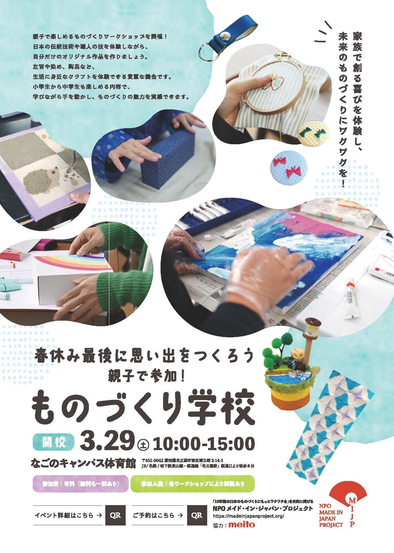名古屋駅徒歩10分のなごのキャンパス体育館にて開催!木工、陶芸、染め物、和紙づくりなど、子どもたちが実際に手を動かしながら、親子で日本のものづくりの素晴らしさを学ぶ機会を提供します。