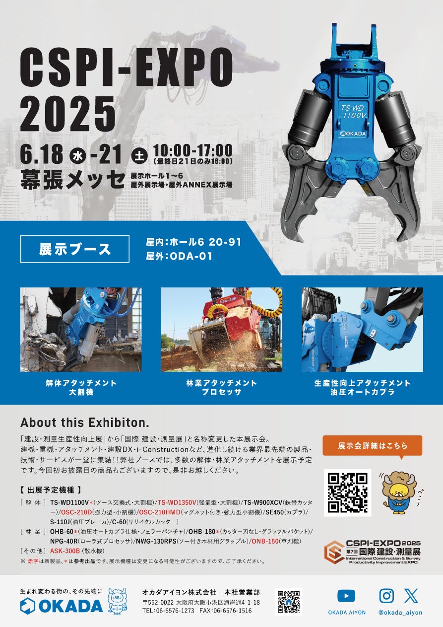 オカダアイヨン株式会社(本社:大阪府大阪市、代表取締役社長:岡田祐司、以下オカダアイヨン)は、6月 18 日 ( 水 ) 〜21 日 ( 土 ) の 期 間 、 幕 張 メ ッ セ で 行 わ れ る 第 7回 国 際 建 設 ・ 測 量 展 ( CSPI-EXPO2025)に出展いたします。