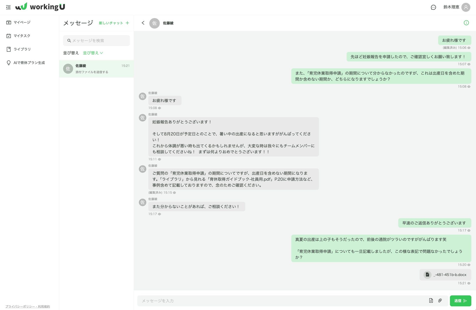 ・育休中の従業員と人事の個別チャットでやりとりを蓄積
