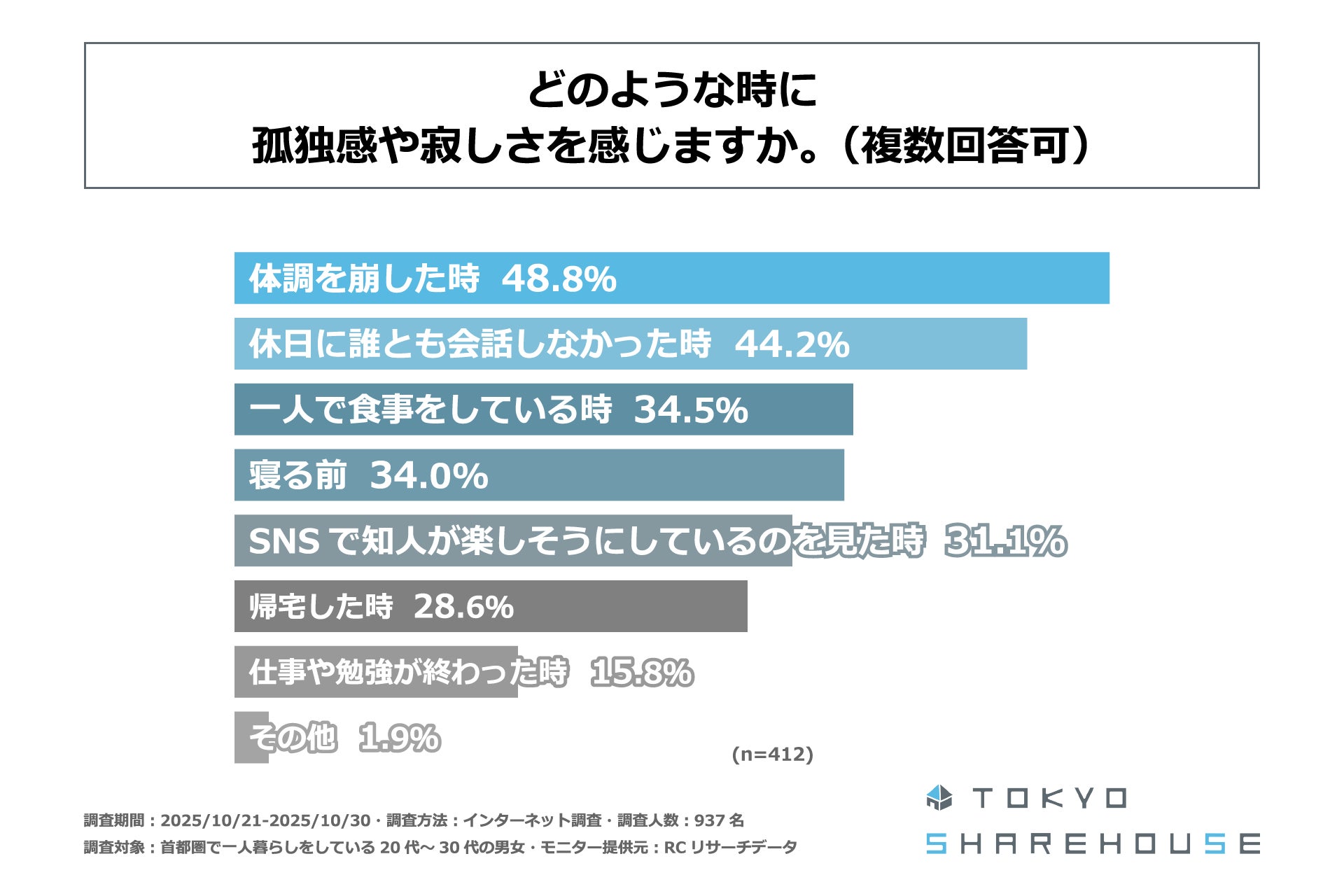 東京シェアハウス合同会社(本社:東京都渋谷区、代表者:森山 哲郎)が運営する「東京シェアハウス」は、東京都、神奈川県、埼玉県、千葉県(以下、首都圏)で一人暮らしをしている20代~30代の男女を対象に「一人暮らしの孤独感に関する実態調査」を実施しました。この調査から、首都圏で一人暮らしをしている20代~30代の男女が、一人暮らしにおいて孤独を感じる場面やその対処法、また今後の人との交流への意向などが明らかになりました。