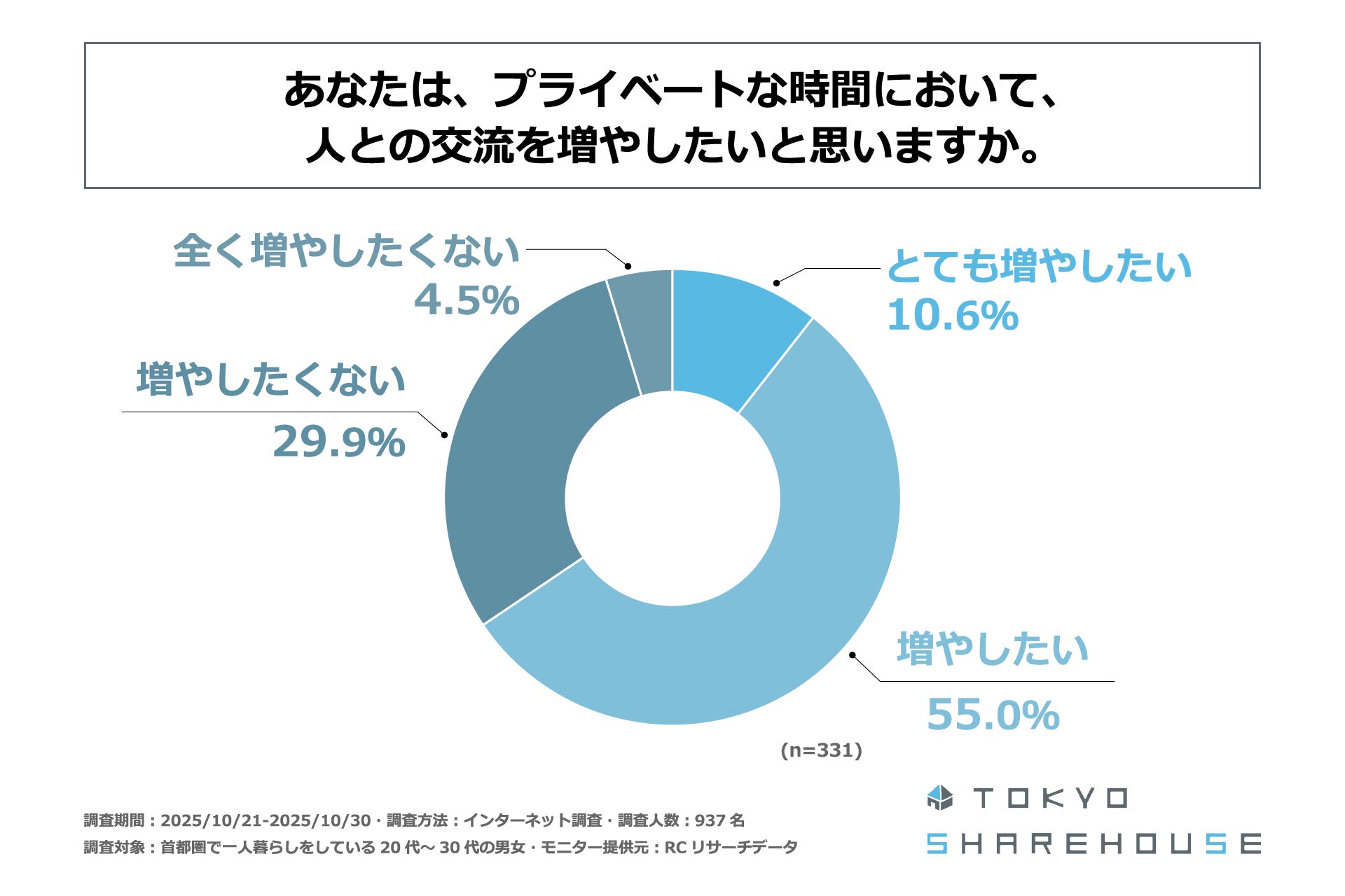 調査の最後、孤独感や寂しさを感じる時に何らかの対処をしていると回答した人を対象に「あなたは、プライベートな時間において、人との交流を増やしたいと思うか」を尋ねる設問への回答では、1位が「増やしたい」で55.0%、2位が「増やしたくない」で29.9%、3位が「とても増やしたい」で10.6%という結果になりました。1位と3位の回答を合計すると回答率65.6%となり、この結果から、首都圏での一人暮らしにおいて孤独感や寂しさを感じた時にその対処をしている20代~30代の男女の65%以上が、プライベートな時間において、人との交流を「増やしたい」と考えていることが明らかになりました。