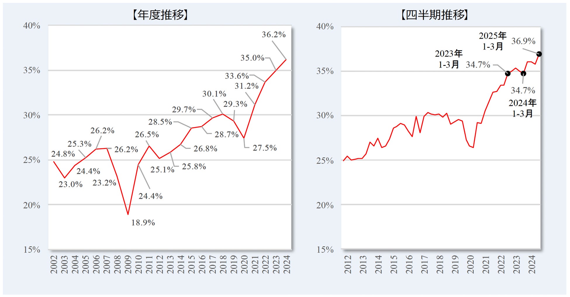 新型コロナウイルスの感染が拡大し始めた2020年1-3月期を起点に大きく水準を切り下げたが、翌年2021年1-3月期には概ね感染拡大前の水準に復した。以降、最高値※1を更新しながら上昇基調を続けており、足元2025年1-3月期は過去最高値となっている。