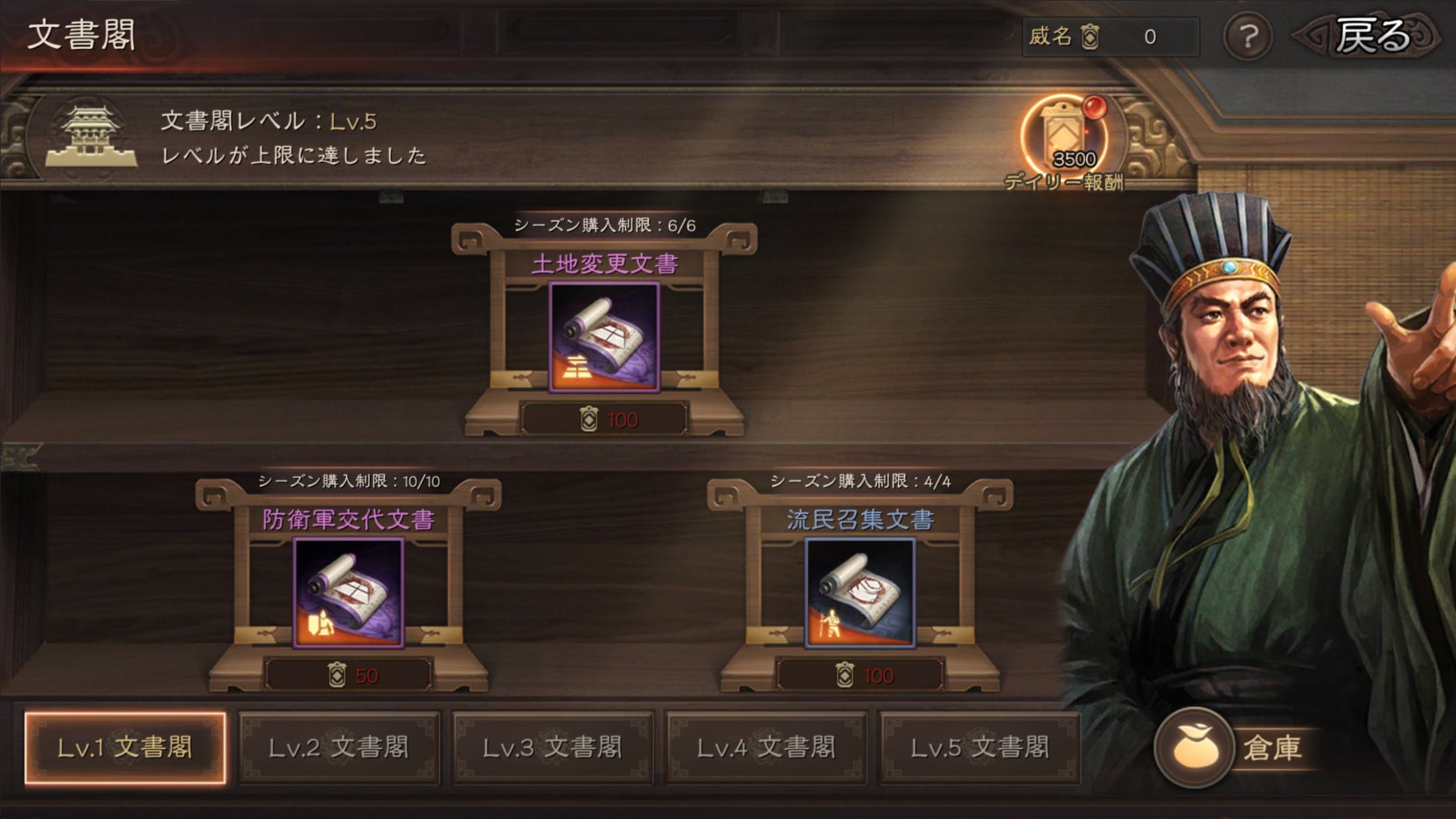 プレイヤーは威名を使用し、開放済みの文書閣で文書を交換できます。威名は毎日受け取ることができ、また活躍によっても獲得できます。文書閣は5つのレベルがあり、年が進むとレベル上限も開放されます。文書閣がレベルアップするとともに、交換できる文書も増えます。