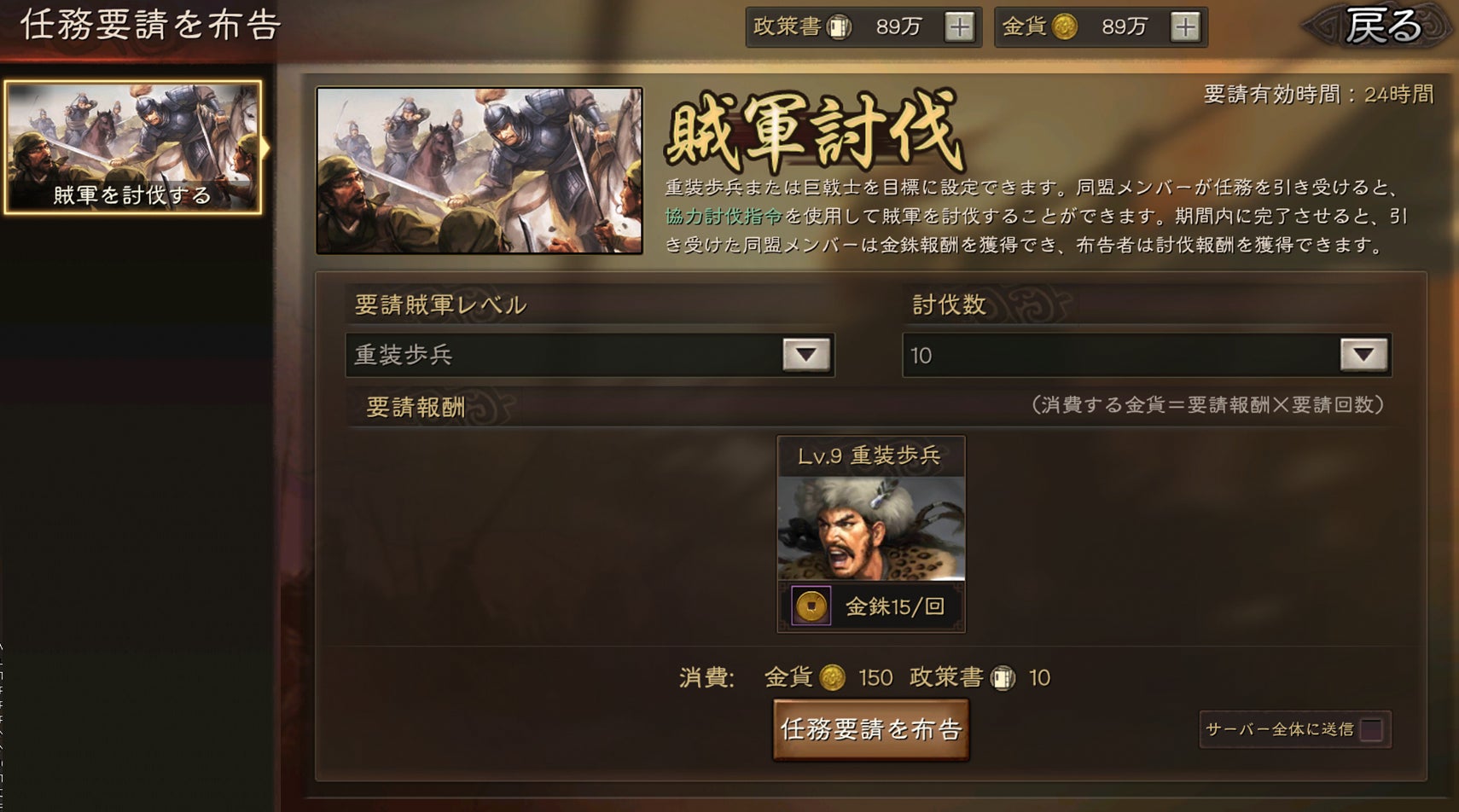 同盟メンバーは金貨を消費し、盟友に特定の任務要請を出せます。討伐任務を完了するプレイヤーは金銖を獲得し、メンバーも報酬を獲得できます。