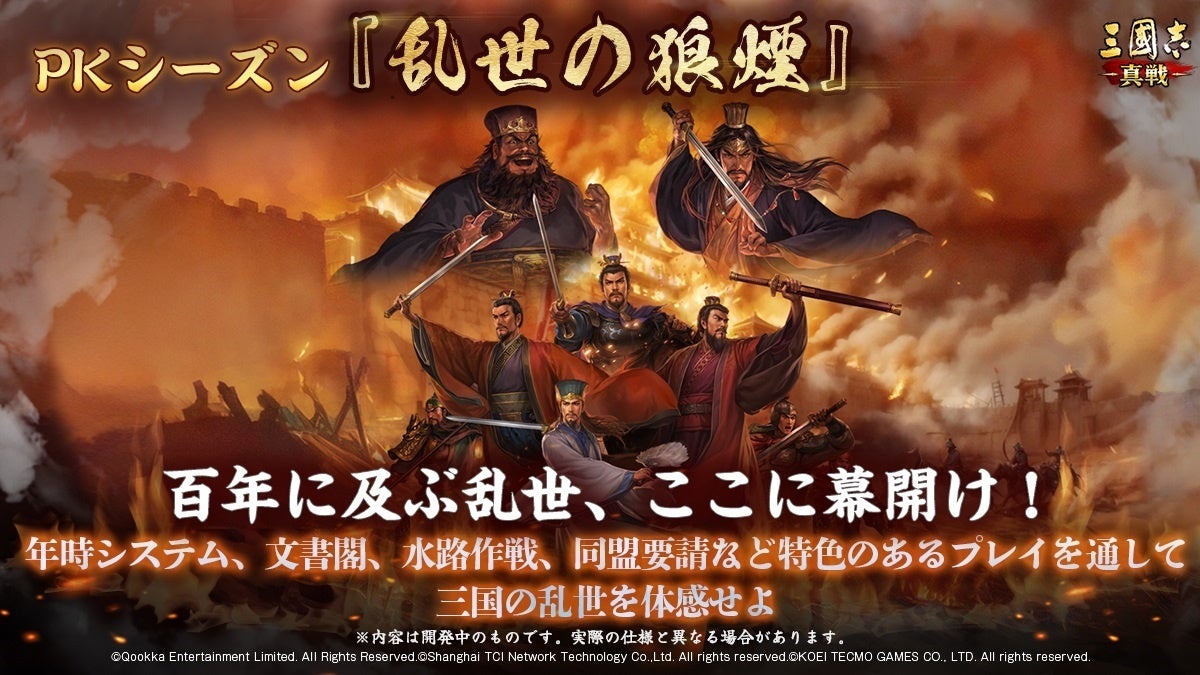 Qookka Entertainment Limitedが株式会社コーエーテクモゲームスの歴史シミュレーションゲーム『三國志13』のIPを使用し、同社監修の元で開発されたスマートフォン向けゲームアプリ『三國志 真戦』。同ゲームは、6月14日(土)より、PKシーズン「乱世の狼煙」を開始することをお知らせいたします。