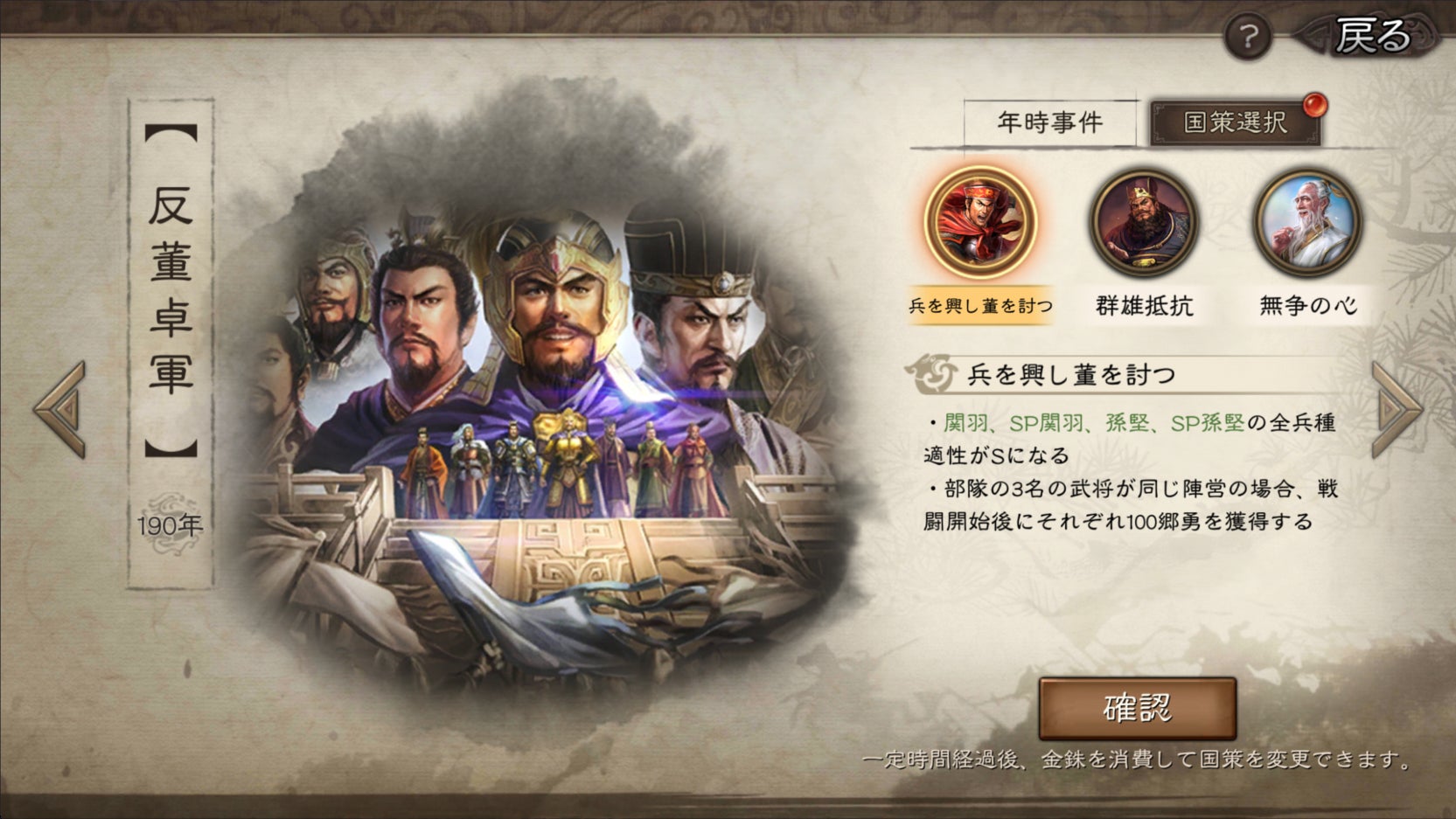 年時事件が発生すると、プレイヤーは国策選択を1回行えます。国策には武将能力バフや様々な補助系バフ効果が含まれており、プレイヤーは選択によって、資源獲得または特定武将に有効な強化効果を獲得できます。