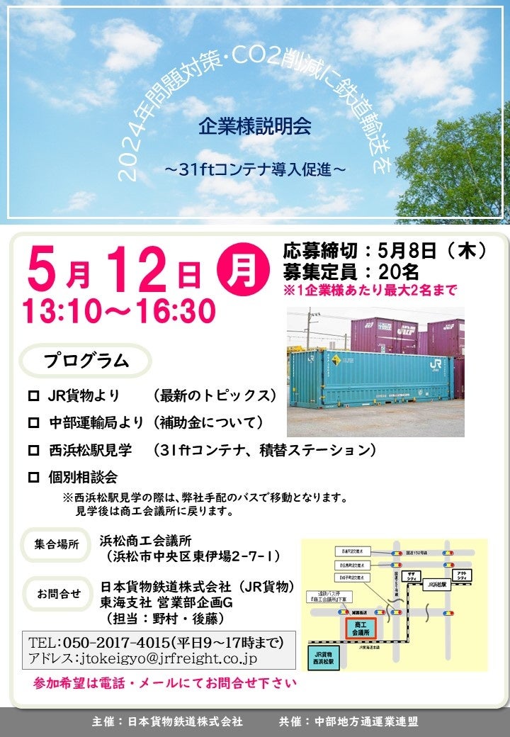 JR貨物 東海支社は、2025年5月12日、「31ftコンテナ導入促進に向けた」企業様向け説明会を浜松地区で実施します。