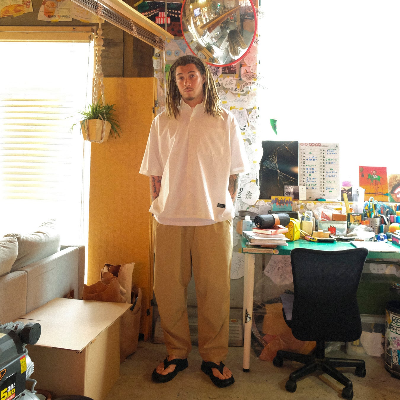 ストリートカルチャーを象徴するスケートボード、バスケ、アート、音楽などと密接にリンクしながら23年目を迎えました。ブランド・アイデンティティーは、オーセンティックなカジュアルを基盤としたオーバーサイズのシルエットと、日本が誇る繊細な仕立て技術と高品質な素材を掛け合わせ、デザイン性と実用性の両方から説得力のあるプロダクトを展開しています。糸から編み立てて、13ozの肉厚生地で仕上げたTシャツは、そのサイズ展開に独自の表記(SKINNY=L、FAT=XL、JUMBO=XXLなど)を用いるなど、ブランドならではの視点が際立っています。