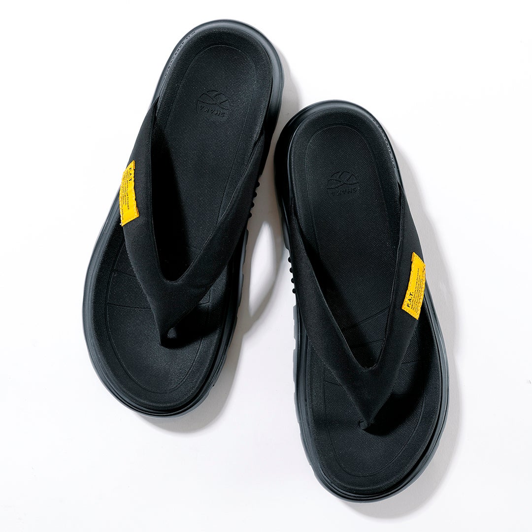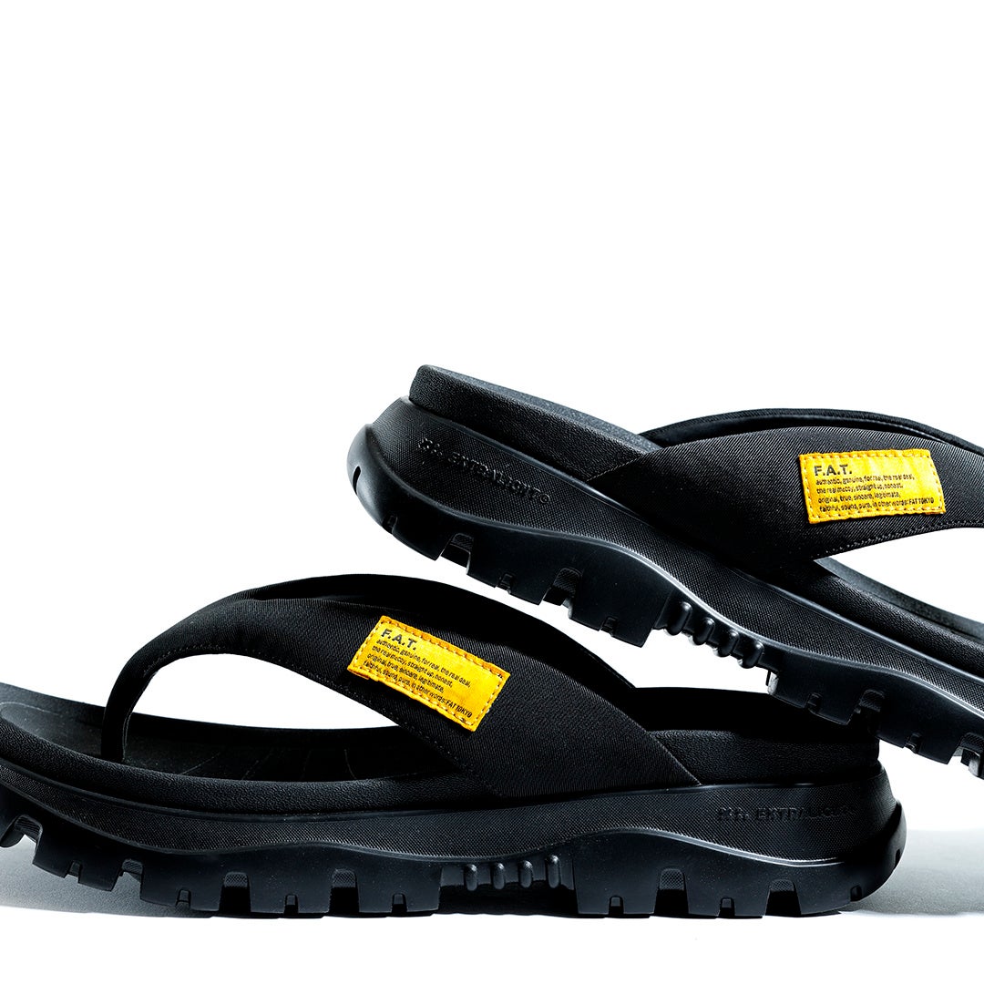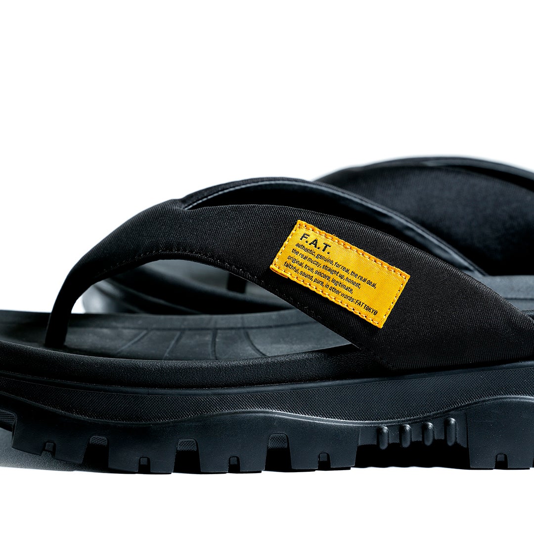 アッパーには、マットで柔らかな質感のネオプレン素材を使用し、鼻緒タイプのベーシックながら、スポーティーになりすぎず、オールブラックでまとめられた中にF.A.T.のブランドカラーでもあるYELLOWブランドネームがアクセントとなったデザイン。