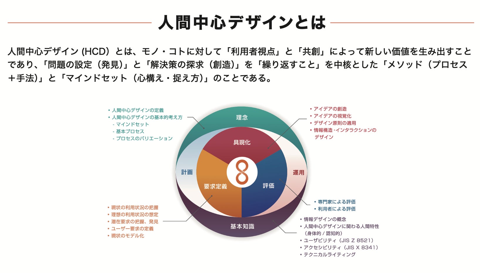 人間中心デザイン(HCD)とは、「利用者視点」と「共創」を基本としたデザイン手法であり、製品やサービスの開発において新しい価値を創造するためのアプローチです。具体的には、「利用者の本当のニーズを発見(問題設定)し、そのニーズに最適な解決策を創造(解決策の探求)」するプロセスを何度も繰り返し行うことが特徴です。また、人間中心デザインは単なる技術的手法に留まらず、利用者視点を持つマインドセット(考え方)を重要視しています。