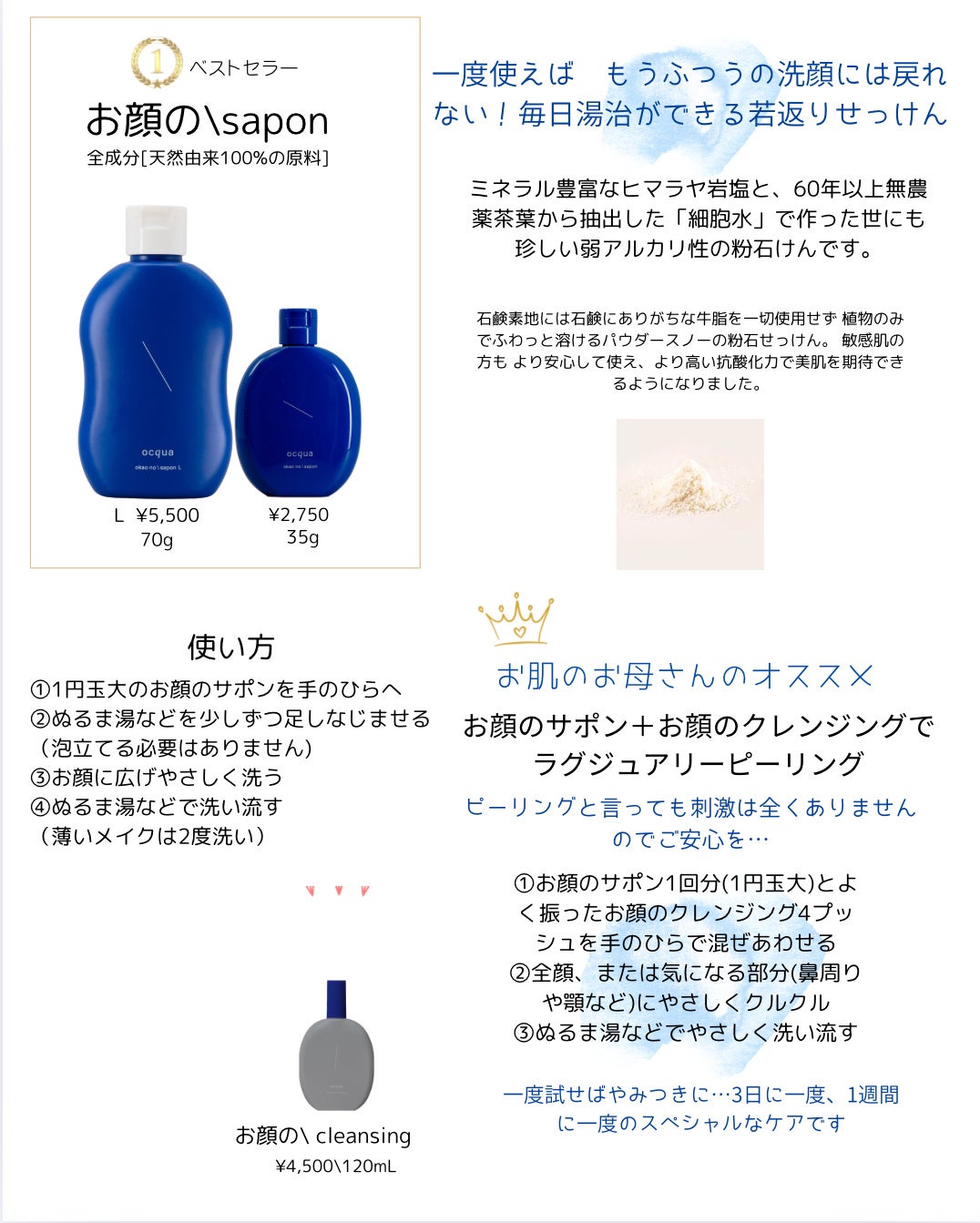 ocquaシリーズに使用しているのは、茶葉の細胞水のほか無農薬の白樺樹液、ガゴメ昆布、はちみつ、ニガリ、海塩、などちょっと驚くものばかり。全て自然から授かった、貴重で優しくそして家族みんなで安心して使い続けられる成分です。お顔のせっけん株式会社は、誰よりも化粧品の経皮毒の怖さを知っている彼女と、それを支える職人たちの力によって、みんなが安心して使える世にも珍しい物作りをしています。