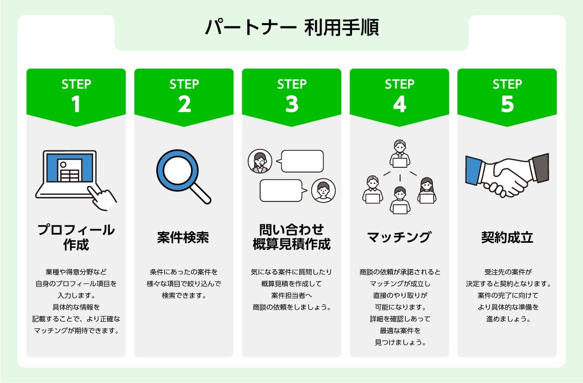 案件の詳細を丁寧にヒアリングし、パートナーの特徴や強みを最大限に活かせる案件をご紹介いたします。また、クライアントのニーズに最適なパートナーを選定し、高精度なマッチングを実現いたします。