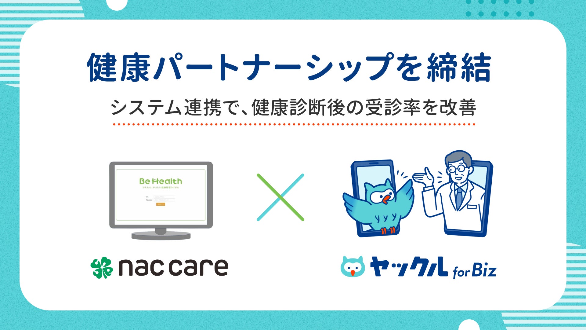 ITを活用したヘルスケア事業を展開する、株式会社エヌ・エイ・シー・ケア(所在地:東京都千代田区、代表取締役:山崎 直人)は、生活習慣病に特化したオンライン保険診療サービスを提供する株式会社ヤックル(所在地:東京都港区、代表取締役社長:布川佳央 以下「ヤックル社」)と、「健康パートナーシップ」をこのたび締結いたしました。