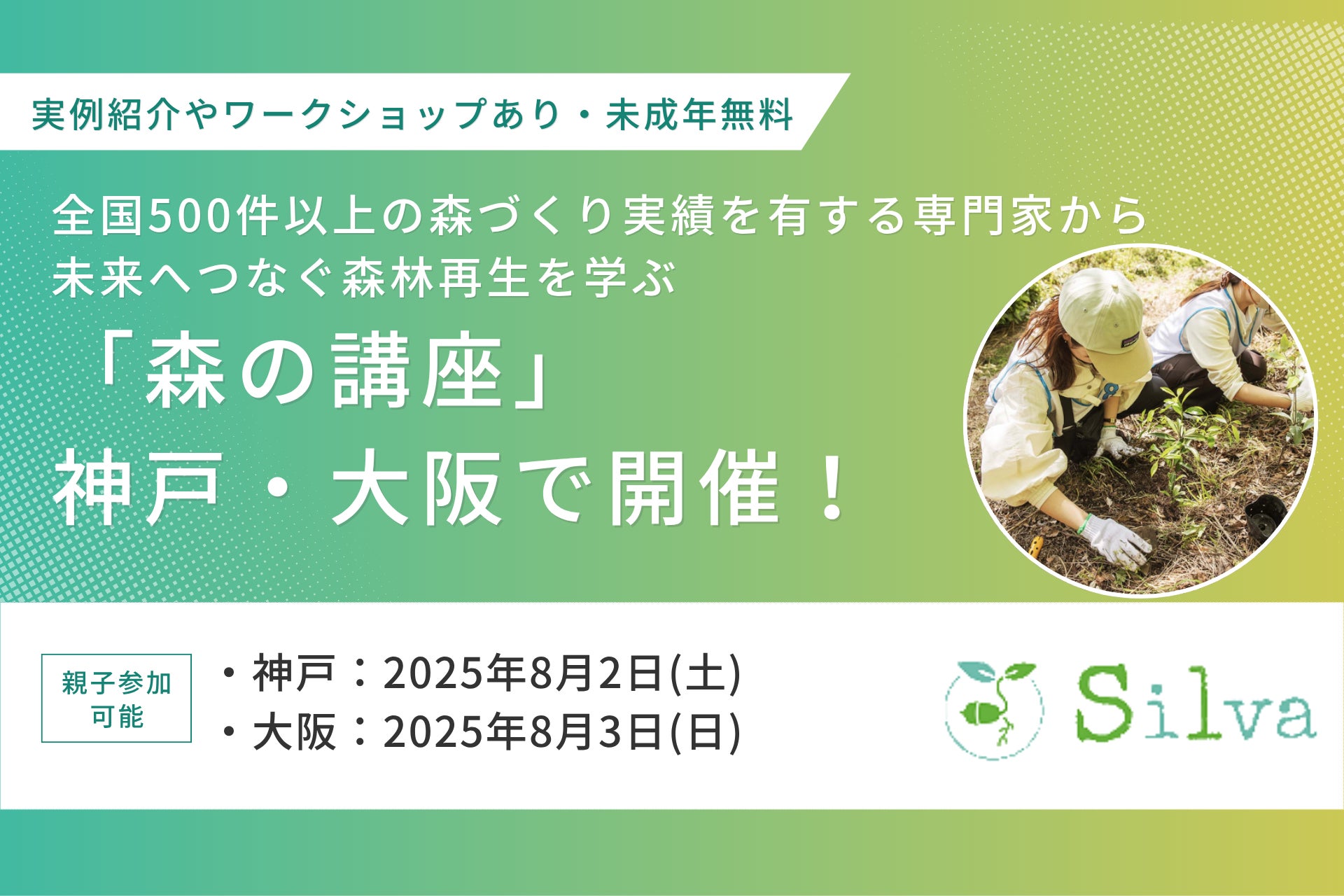 次世代に続く持続可能な緑の復元を目指し森づくりを行う非営利型一般社団法人Silva(シルワ)は、2025年8月2日(土)に神戸、8月3日(日)に大阪にて、森林再生について学べる「森の講座」を開催します。講師は、全国500件以上の森づくり実績を有する当団体代表理事の川下 都志子で、気候変動や自然破壊が進む現代において、土地本来の森の機能や役割、そして森の再生方法について解説します。