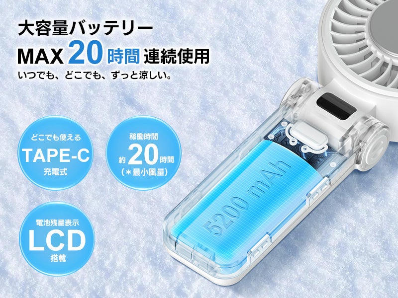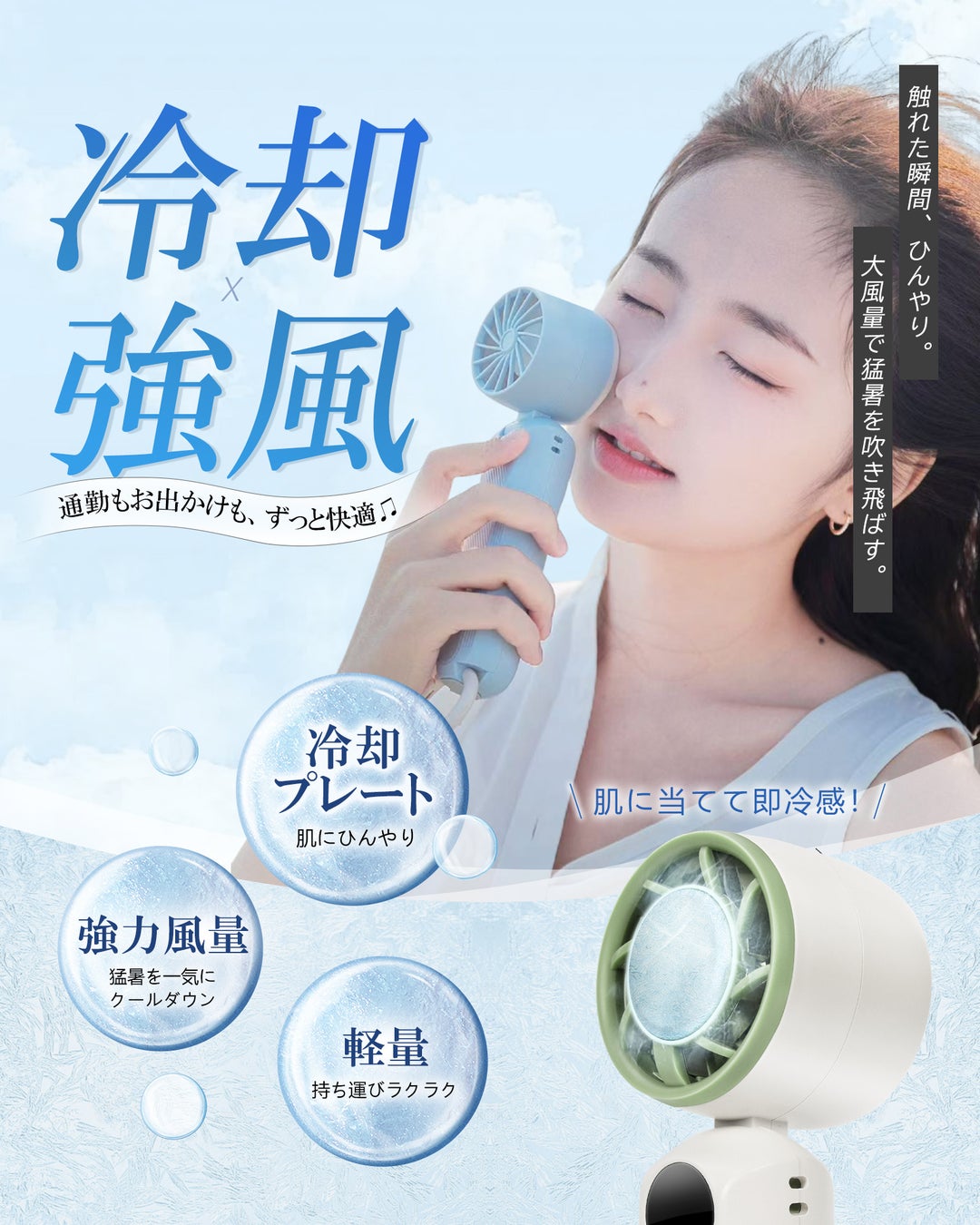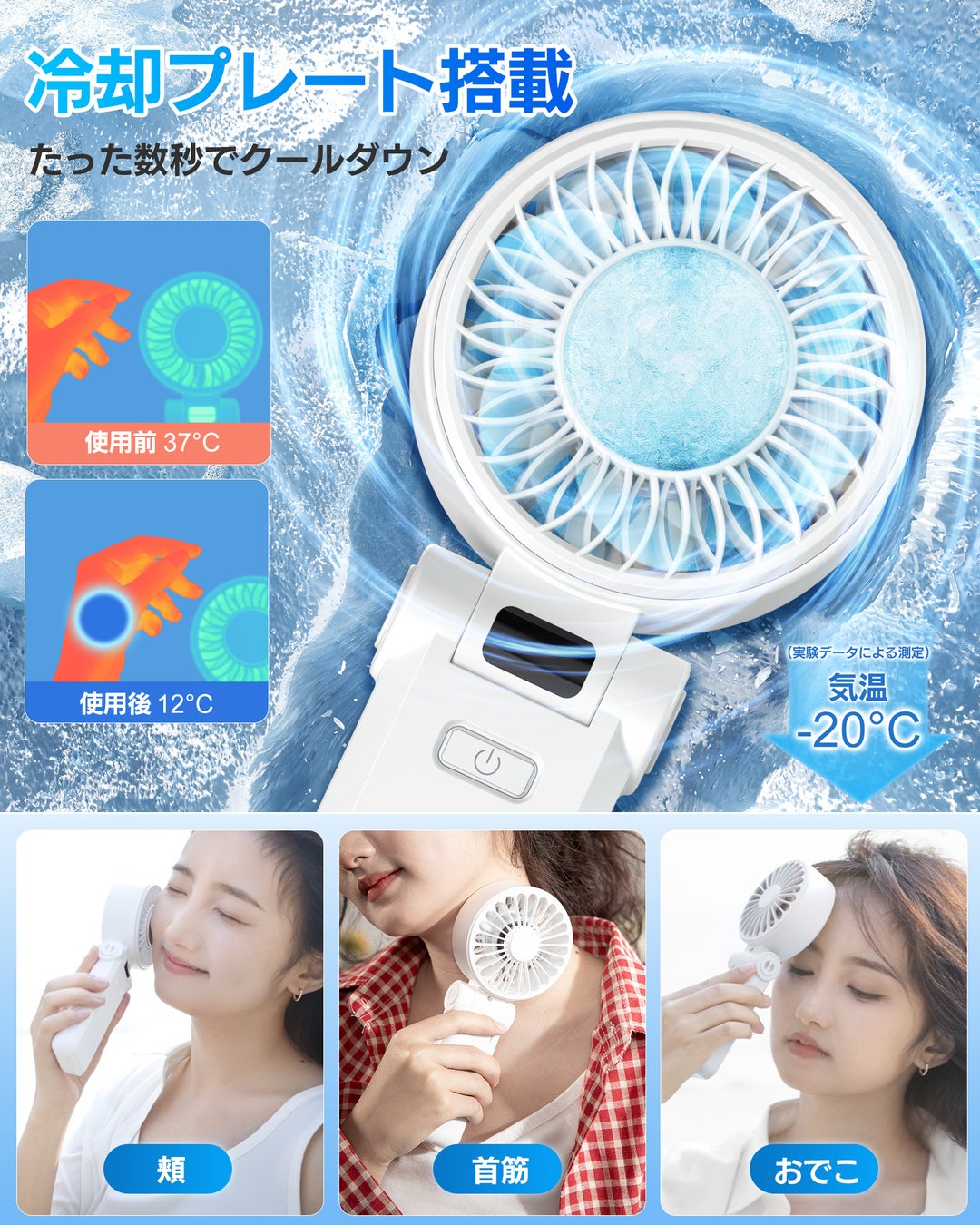 ハンディファン冷却プレートはペルチェ素子を採用し、火照った頬や首当てた瞬間、まるで冷えた缶を触ったようなキュッと冷たい感覚が広がり、瞬時に冷却効果を得られます。不快な暑さもスッと引く。熱中症対策にもぴったりです。ハンディクーラーは冷却プレートとファンを最強モードで同時使用しても、約1時間30分の連続使用が可能、日差しが強い通勤・通学中に最適です。