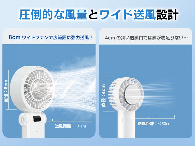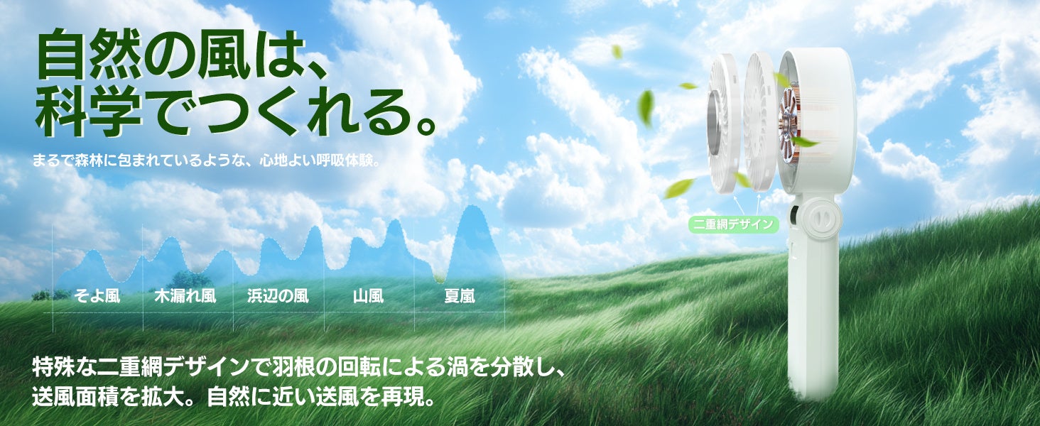 高性能ブラシレスモーターX5枚羽根の組み合わせにより、ハンディファンは最大5m/sの強力な送風を実現。5段階の風量調節機能で、柔らかな風から力強い強風まで、お好みに合わせて選べます。吹き出し口の幅は8cmと広く、一般的な冷却プレート付き扇風機の2倍以上のサイズで、顔から首までを包み込むように涼しさを届けます。更に、ハンドファンの二重ガード構造により乱流を抑え、自然な風を再現するふんわりとした優しい風が顔全体に心地よく届きます。携帯ファンの指挟み防止設計で、子供の安全性も向上しました。