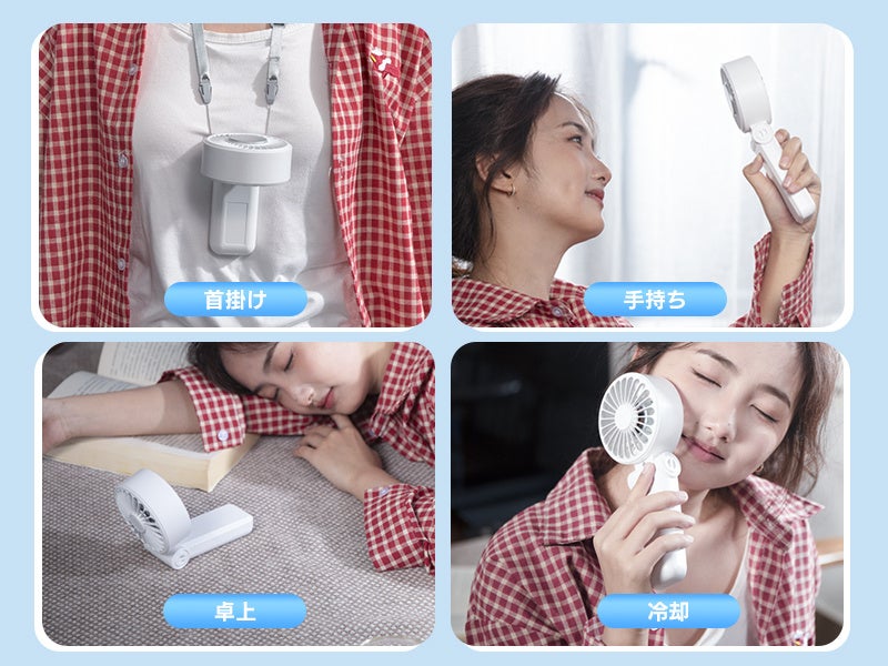 ハンディファン首掛け・卓上・手持ち・冷却プレートの4WAY使用に対応し、使い方は自由自在。ハンディクーラーの首部分は180度の角度調整が可能で、送風の方向も細かくコントロールできます、卓上扇風機としても最適です。ハンディ扇風機付属のストラップを使えば、首に掛けたまま両手フリーで移動可能。ミニ扇風機は軽量設計(約245g)でコンパクトなサイズ(198*83*40mm)、外出前にバッグに入れておけば長時間持ち運びできます。