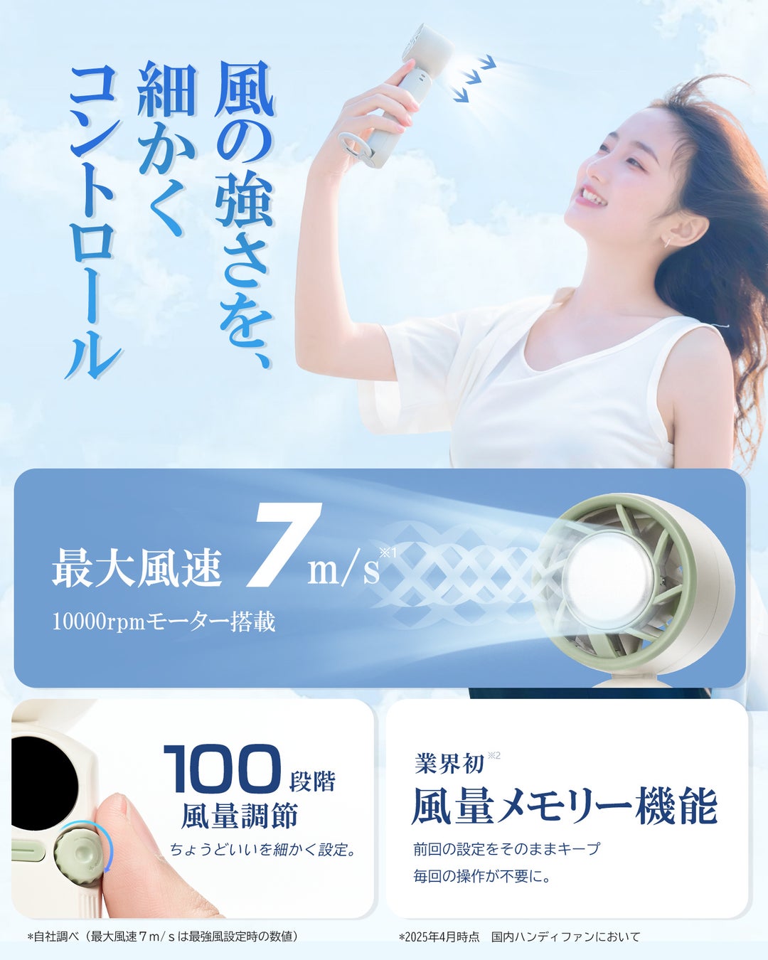 H09ハンディ扇風機は風量はダイヤルをスライドするだけで1〜100段階まで無段階調整可能、やさしい微風から強力な風まで、使用シーンやお好みに合わせて、細かく調整できます。ハンドファンはメモリー機能搭載で、前回の風量設定を自動で再現。毎回の調整の手間がなく、電源を入れるだけで自分好みの快適な風をすぐに体感できます。静音ハンディファンの稼働音は弱モードで約25dB、最強モードで約45db、寝室や図書館、会社など静かな環境でも周囲を気にせず使用できます。携帯ファンの電源オン・オフは長押しで操作するため、カバンのなかで誤作動を起こす心配もありません。