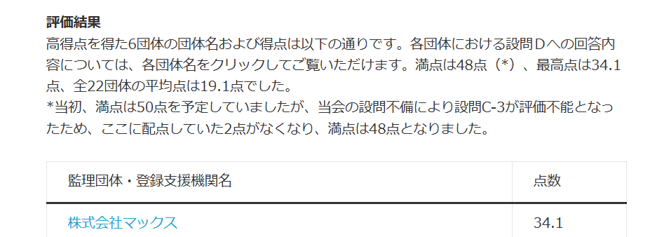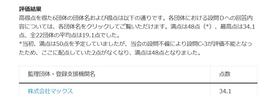 その中で当社は34.1点を獲得し、参加22団体の中で最高得点を記録いたしました。上位団体の中においても、相対的に高い評価を頂戴しております。
